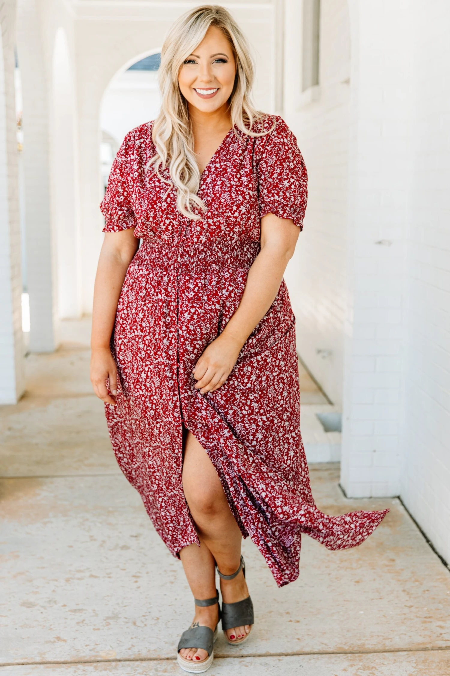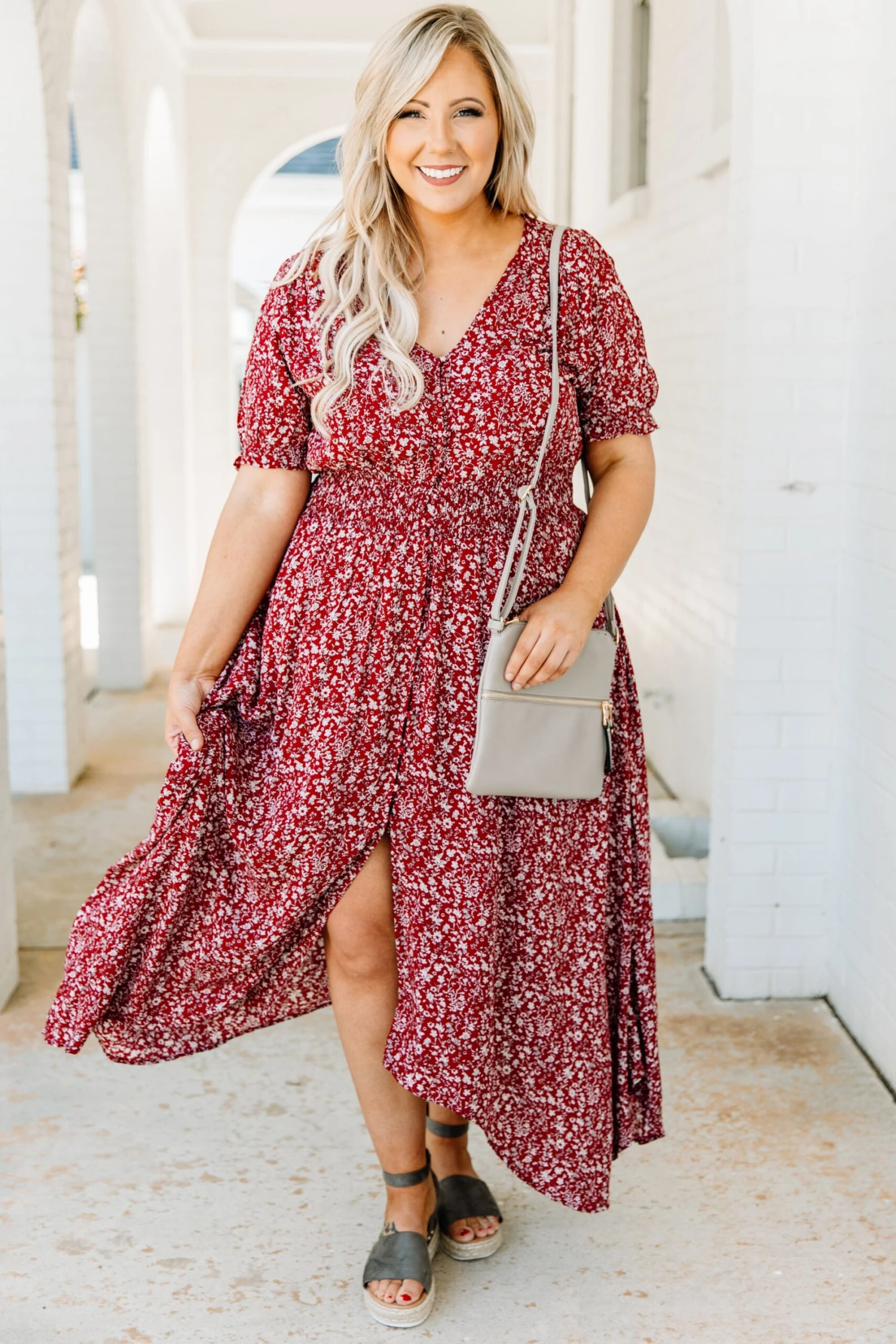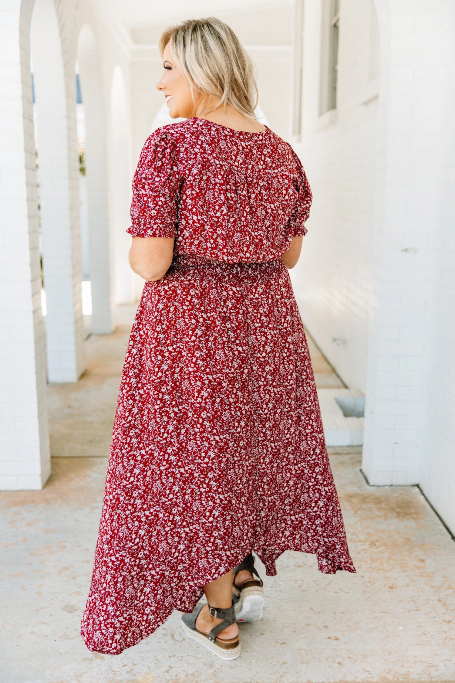 We absolutely love this dress and are so glad you found it! This dress has a pretty floral pattern with a bold red color that’s perfect for the season! It’s comfortable for all day wear, has a figure-flattering fit, and features a maxi-length for the ultimate look! Pair this dress with sandals or wedges for an effortlessly chic look!Â