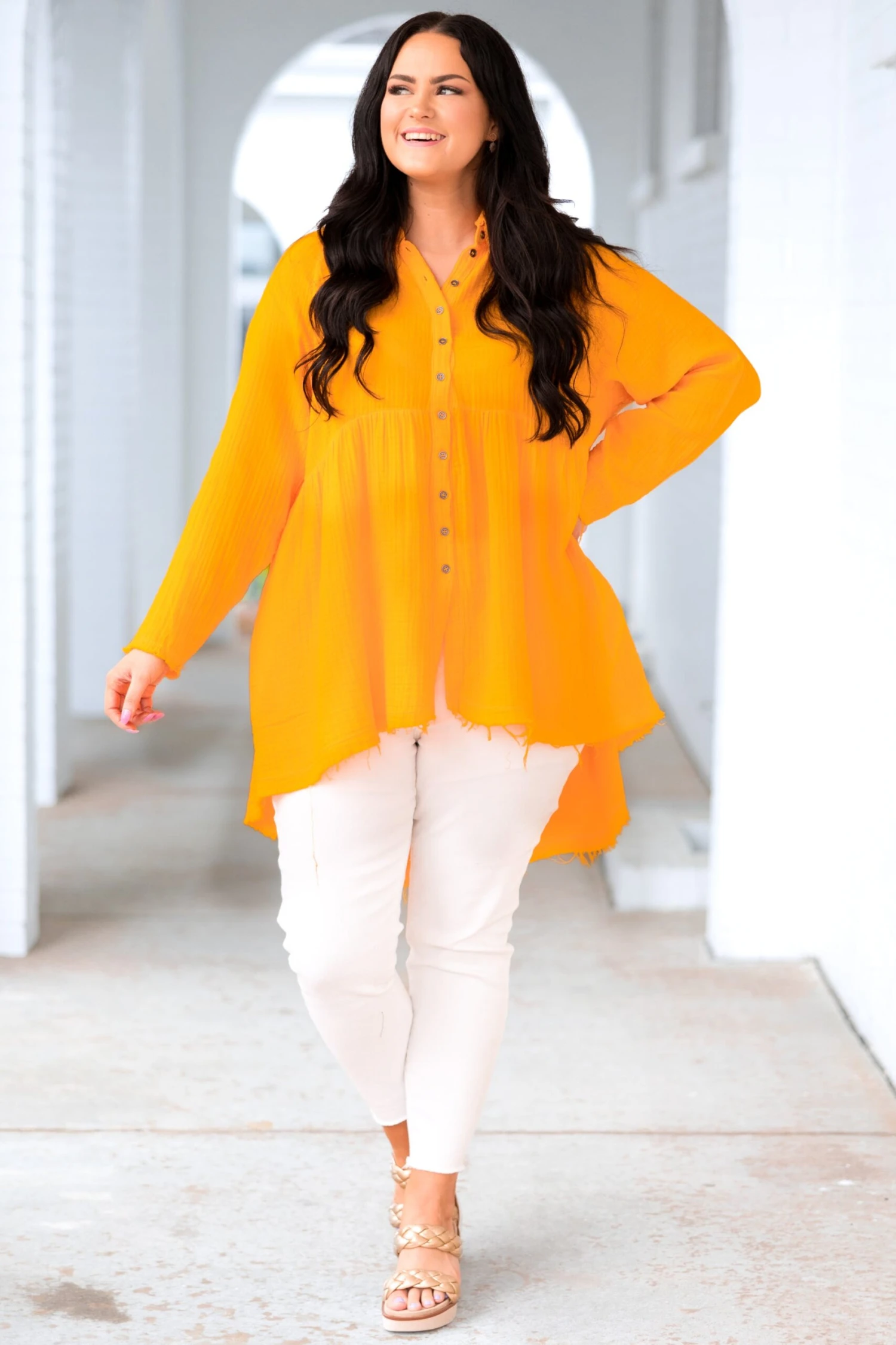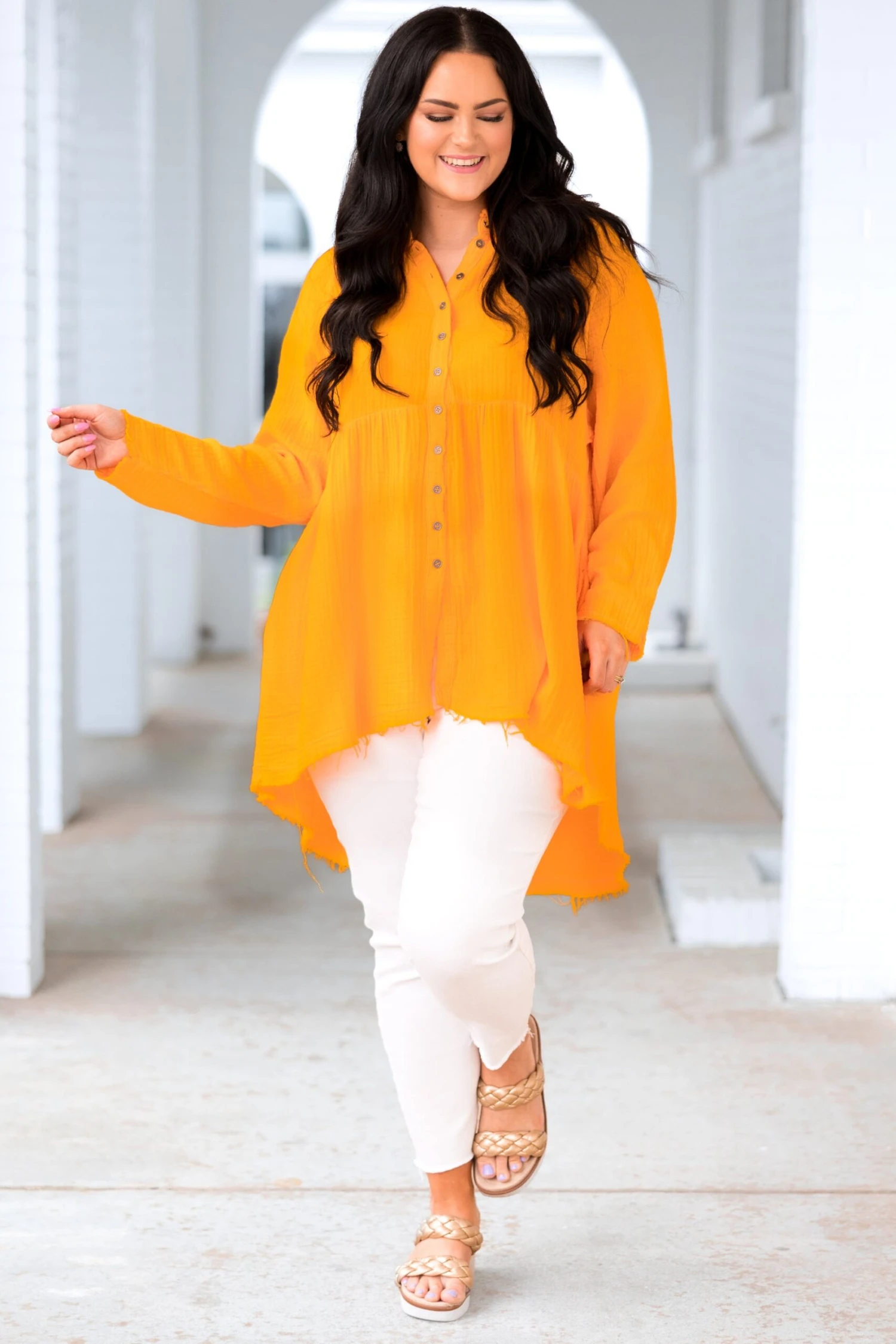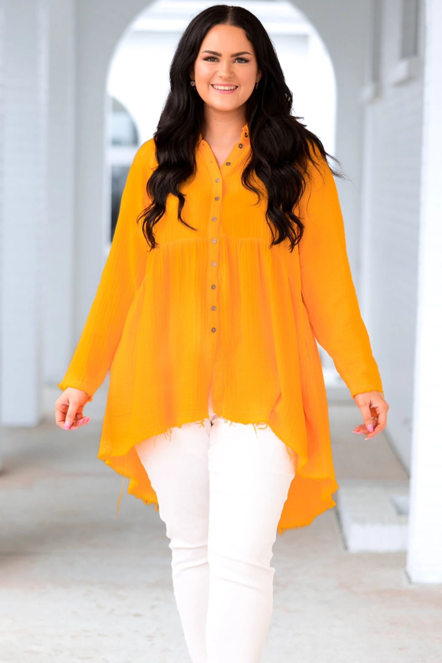 Let this top carry you through the season! It is perfect for any occasion! It features a frayed hemline and mesmerizing silhouette that will keep you looking stylish! Crafted from lightweight fabric, this top will be a must-have for your wardrobe!