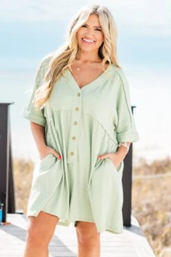 Throw on this beauty and head out for a day of fun! This romper in sage is crafted from comfortable, stretchy material and features functional buttons and pockets! Perfect for day or night, this romper is a must-have addition to your wardrobe! Stay stylish and comfortable with this effortless piece!
