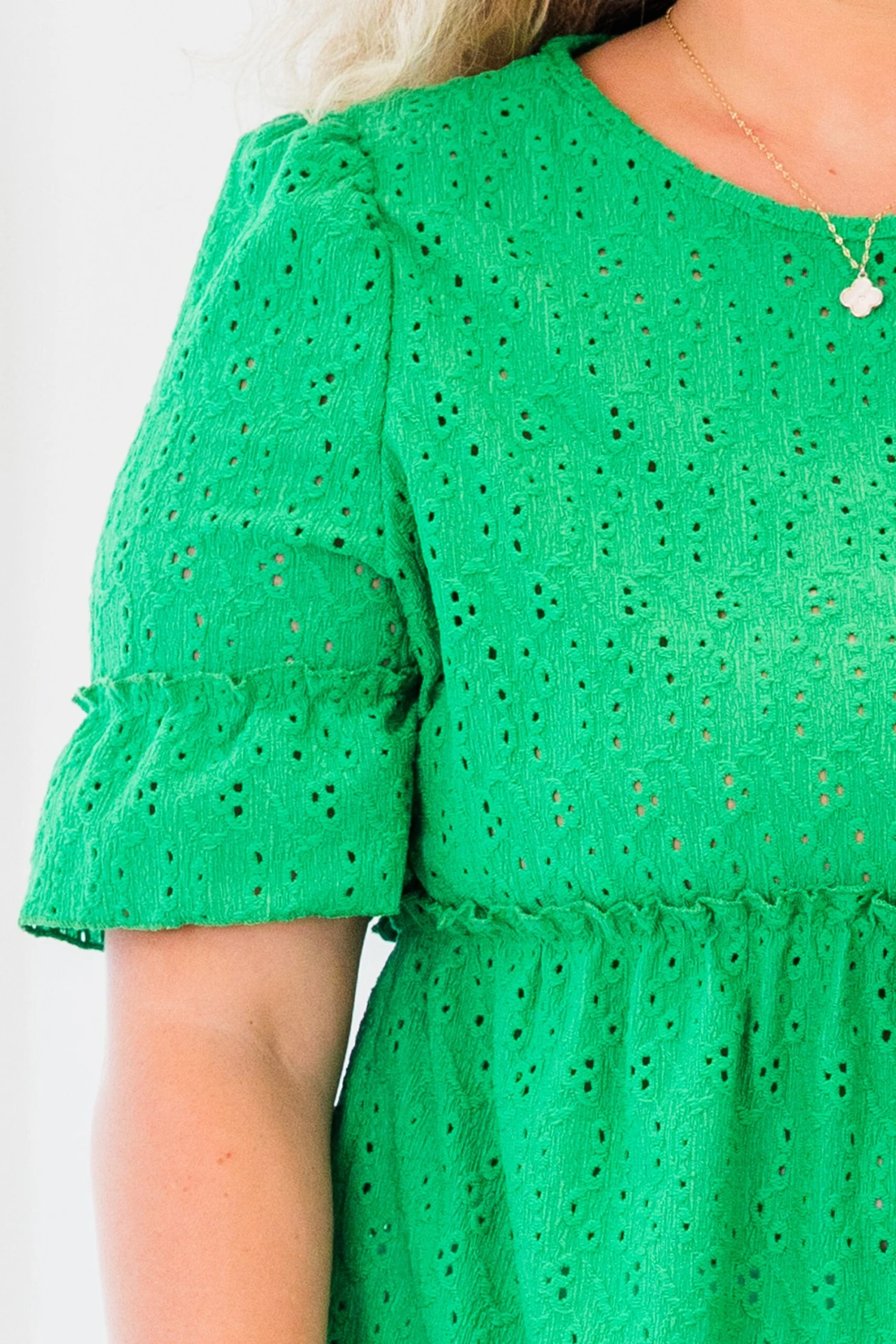 Take your style to the next level with this top in eye-catching kelly green! The textured design and lace detailing make this babydoll-style top stand out, while its bold color ensures you will make a statement!