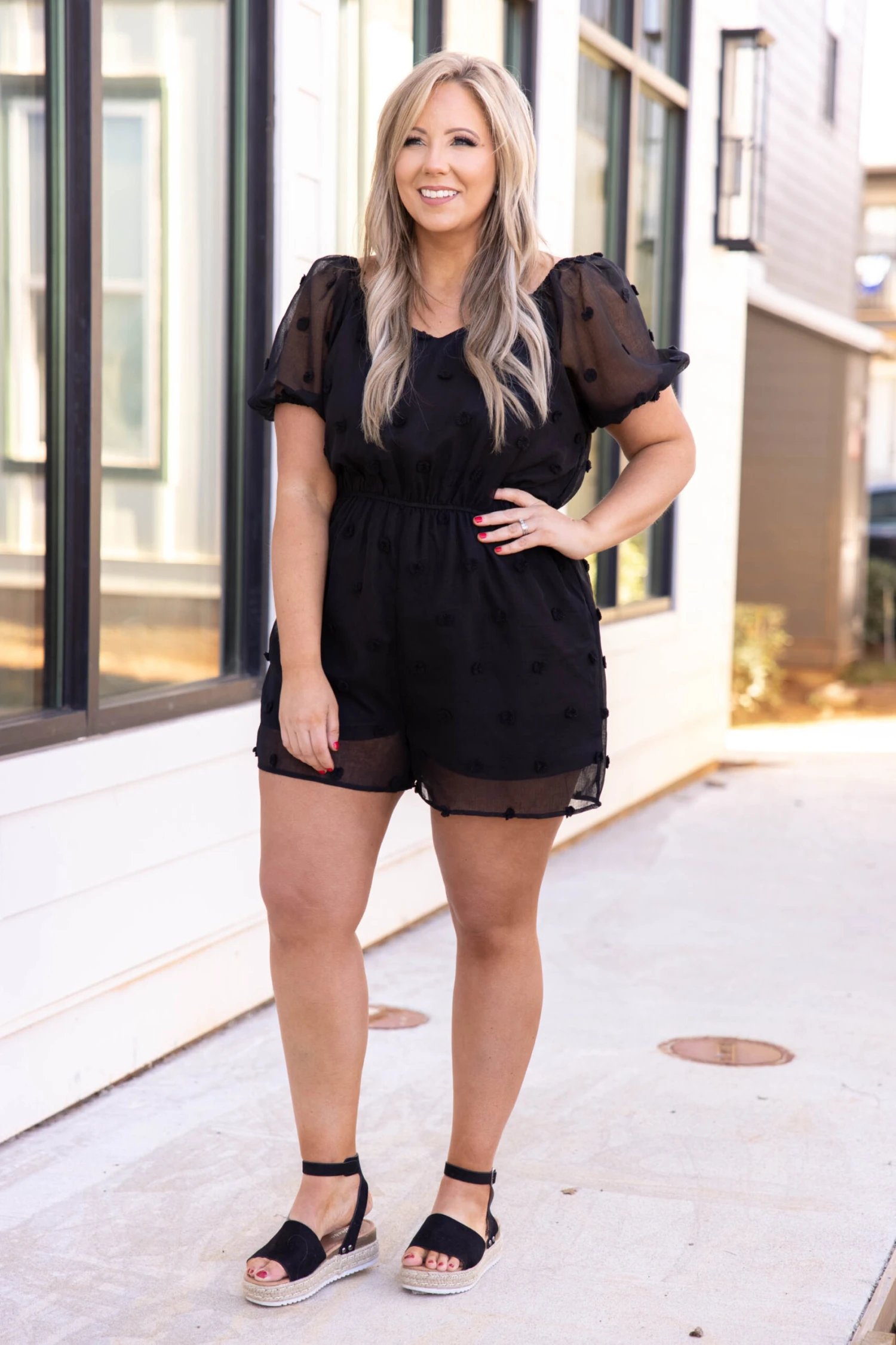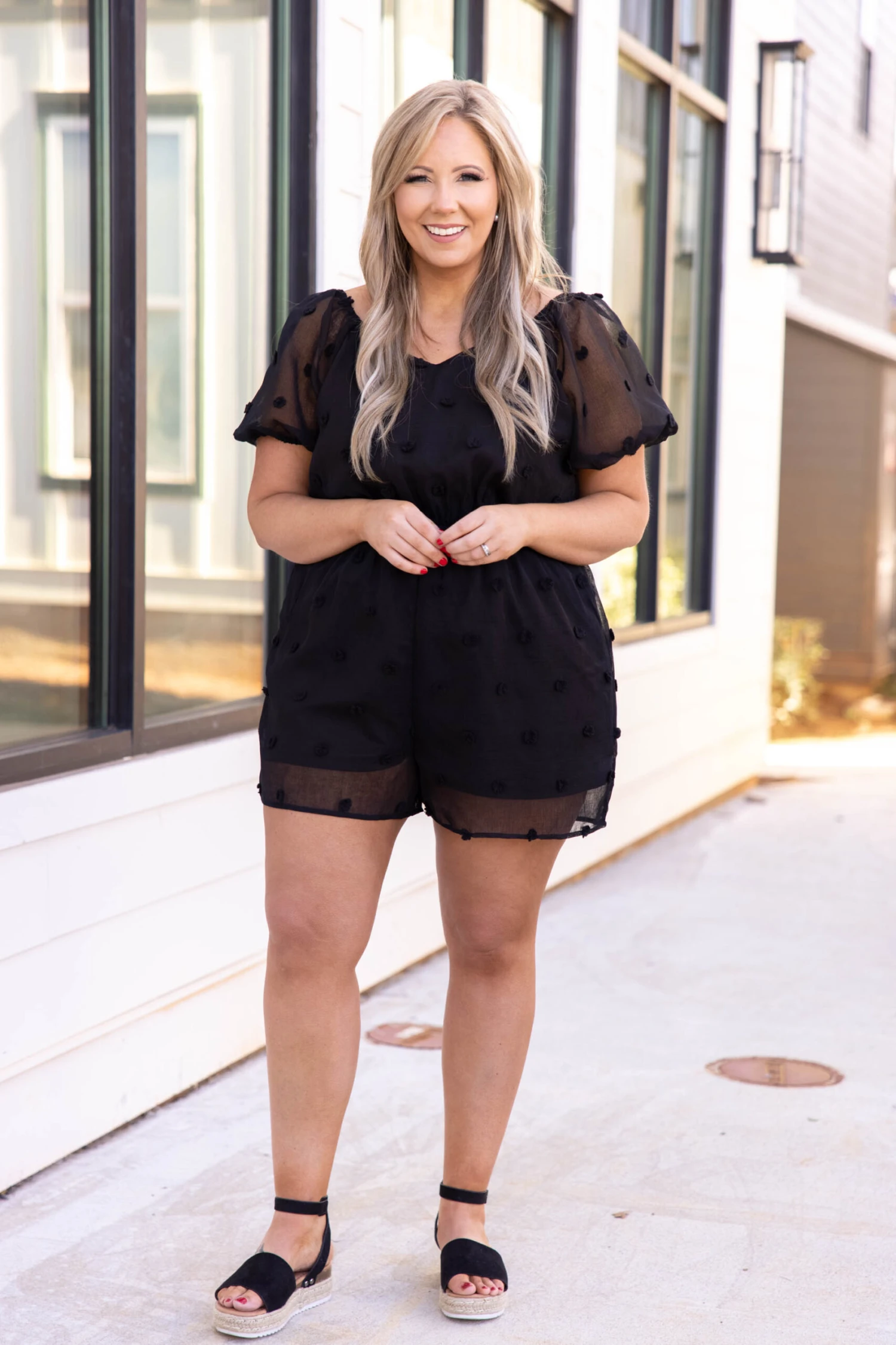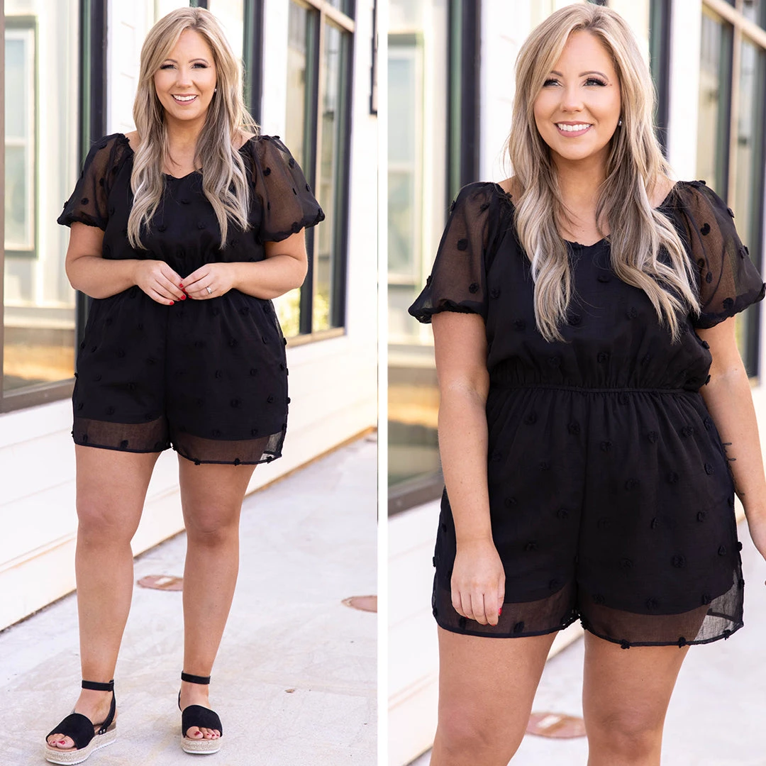 This romper is timeless! It features a beautiful black color that is sure to stand out for every occasion! The raised dot pattern is so on-trend and the bubble sleeves are the perfect added touch! This dress is figure-flattering for all body types and comfortable for all-day wear! Pair this romper with your favorite heels and accessories for a chic, trendy outfit!