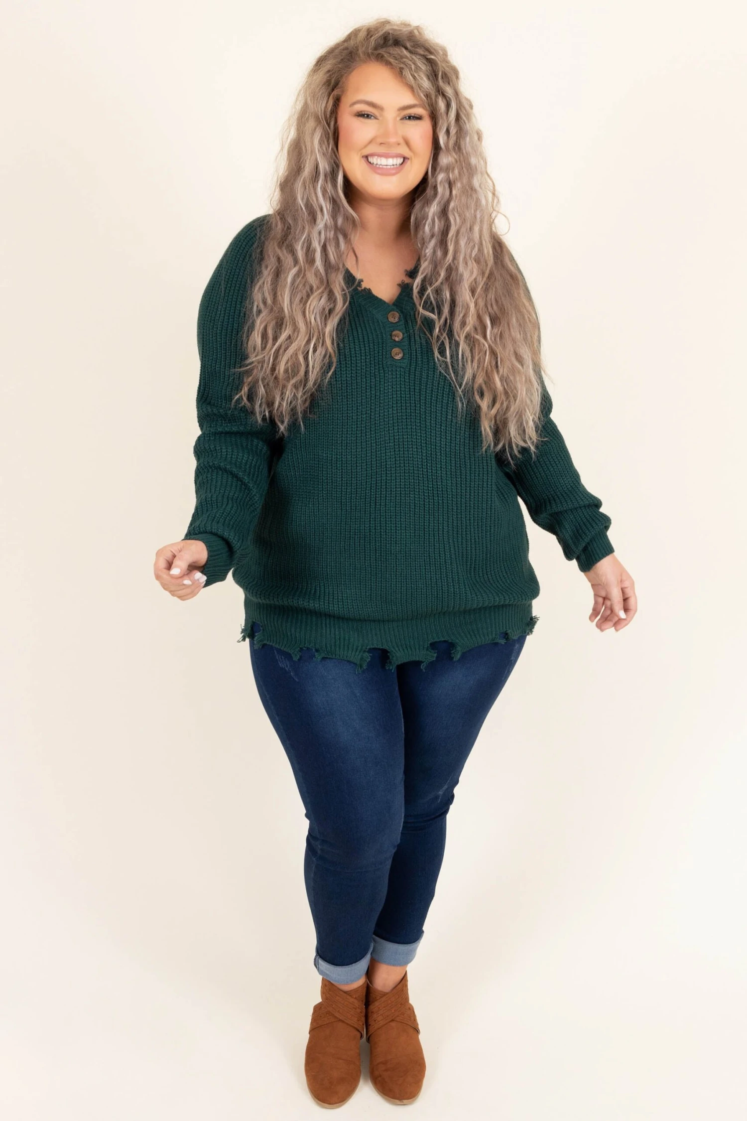 Everyone will want to be near you in this beautiful sweater! The bold hunter green color and sweet frayed neckline and hemline is SO chic! This sweater has a figure flattering fit and is so comfy for all day wear! Simply style this sweater with some skinnies and booties for a timeless, trendy look!