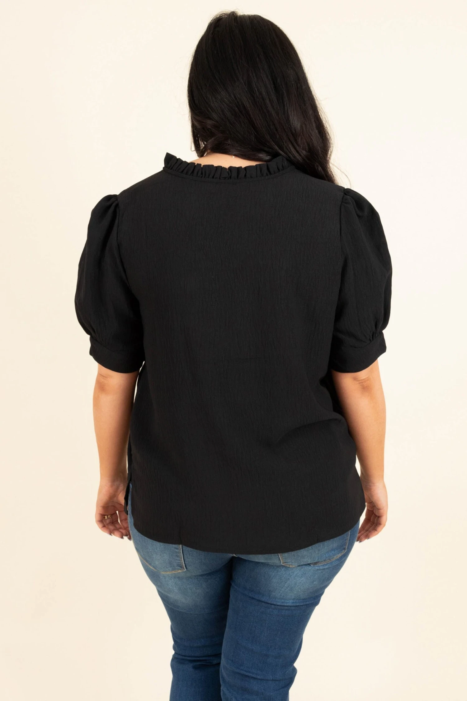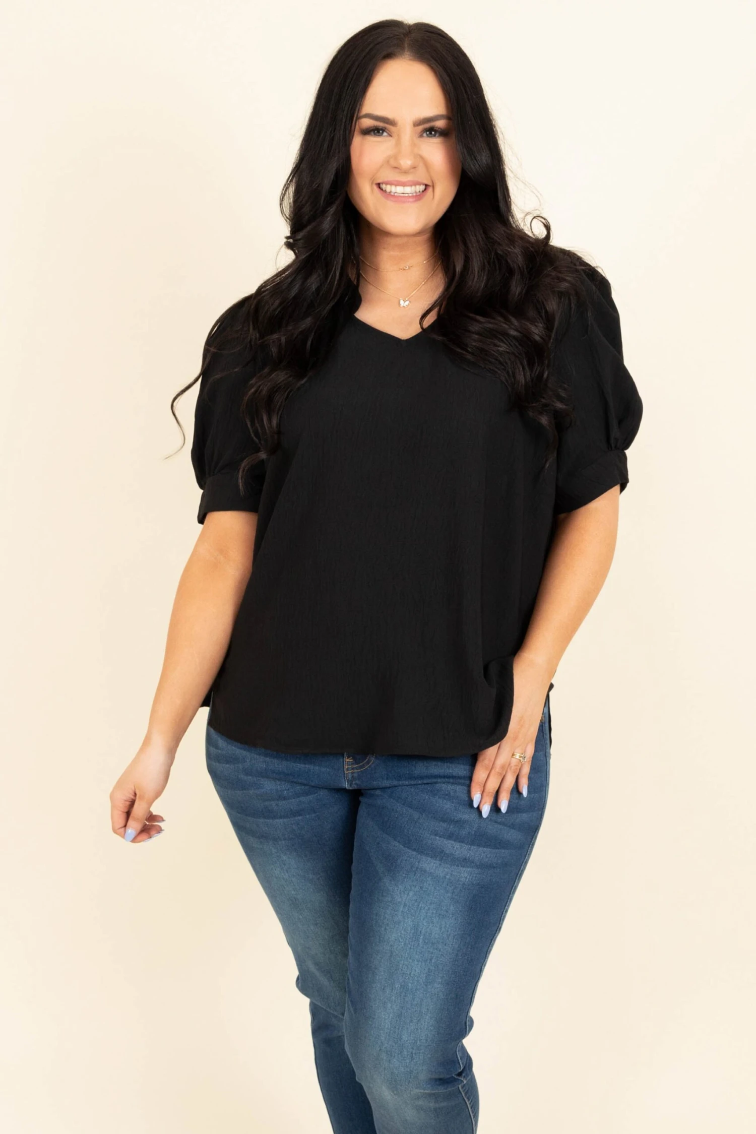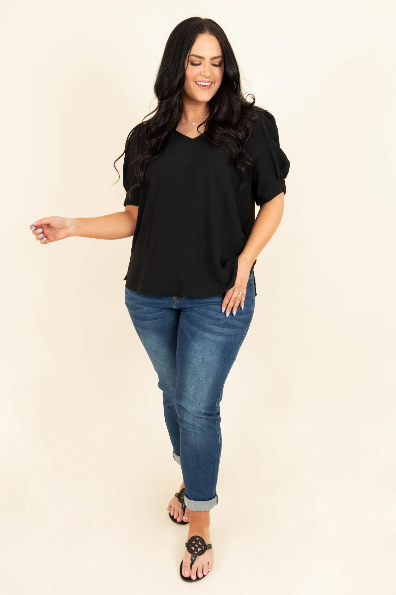 the sky is the limit in this cutie! This top has a neutral black color with an elegant look that is so versatile and sweet! The bubble sleeves and figure flattering fit are just what you need for your wardrobe this season! Style this top with some skinnies or patterned pants for a look you’ll never forget!