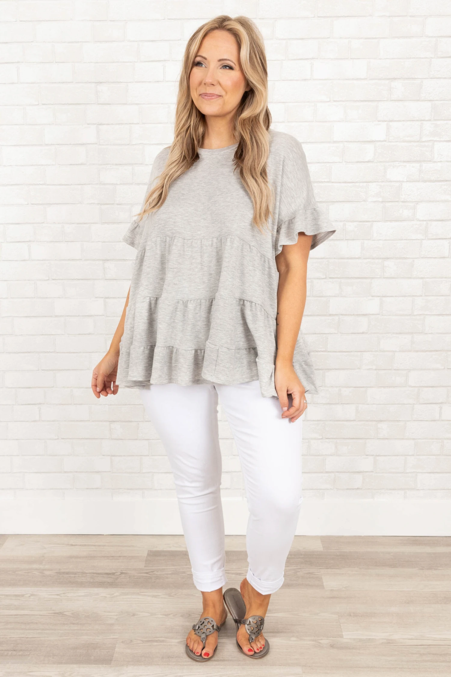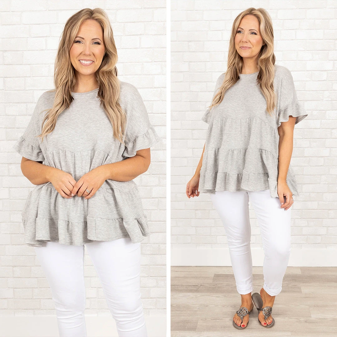 You + this gorgeous top = together forever! This top has a heather gray color that is so simple to style with all of your fave bottoms and accessories! The stretchy, figure flattering fit is great for all day wear throughout the season! Style this top with some jeggings and sandals for a classic chic look!