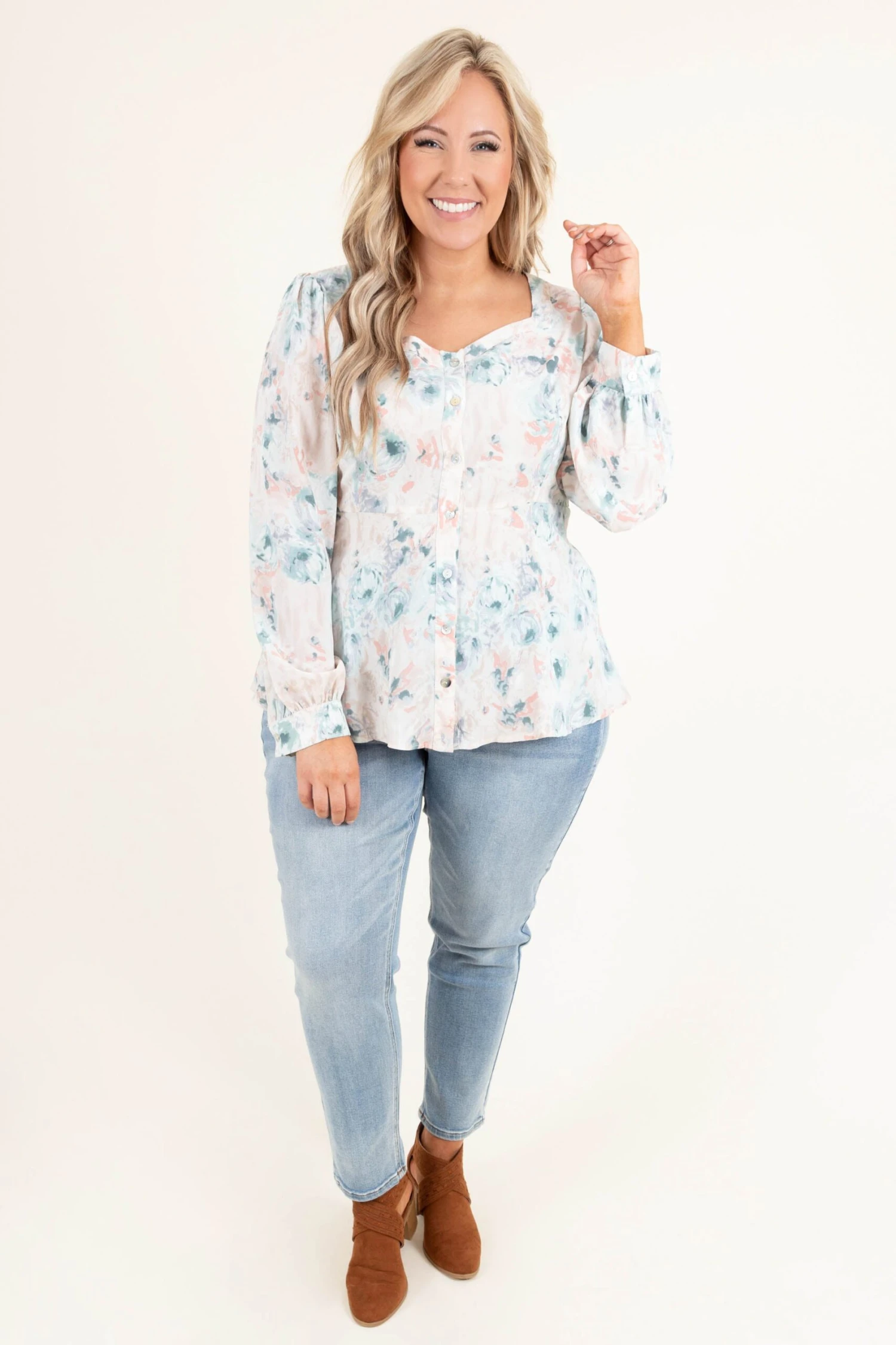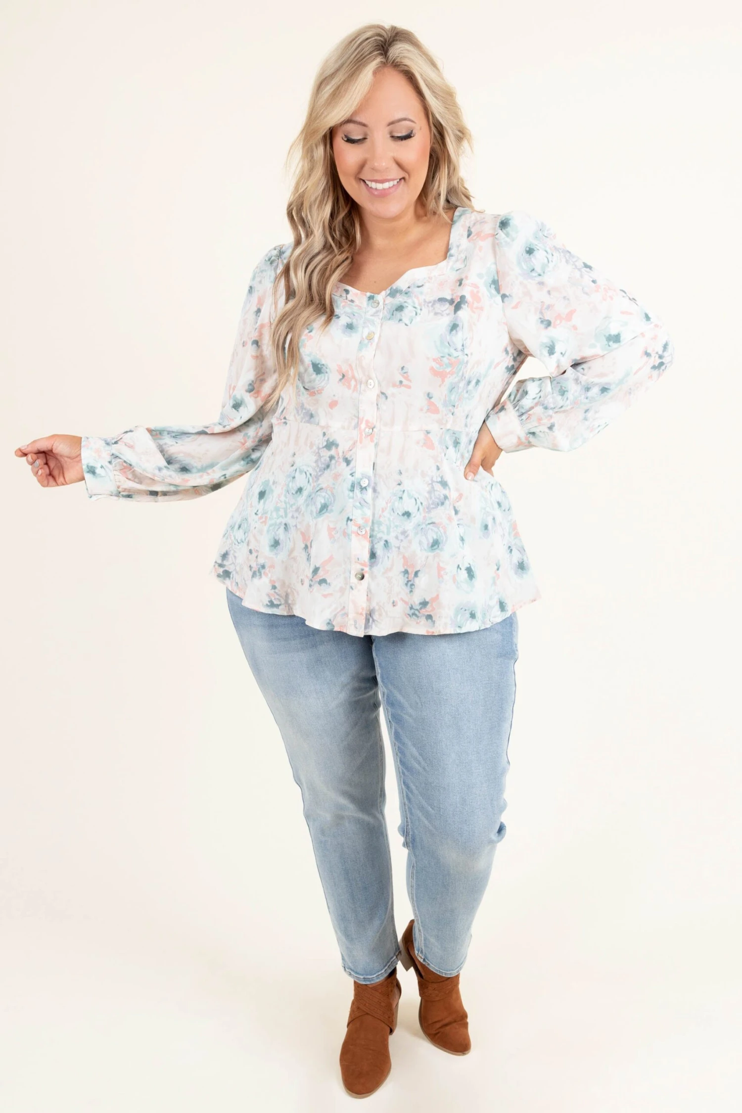 We absolutely LOVE this beautiful top! This top has a soft floral design with a vintage neckline that is so chic! The flowy, figure flattering fit is perfect to pair with all your favorite bottoms! Simple style this top with some skinnies and booties for a casual, trendy look!Â