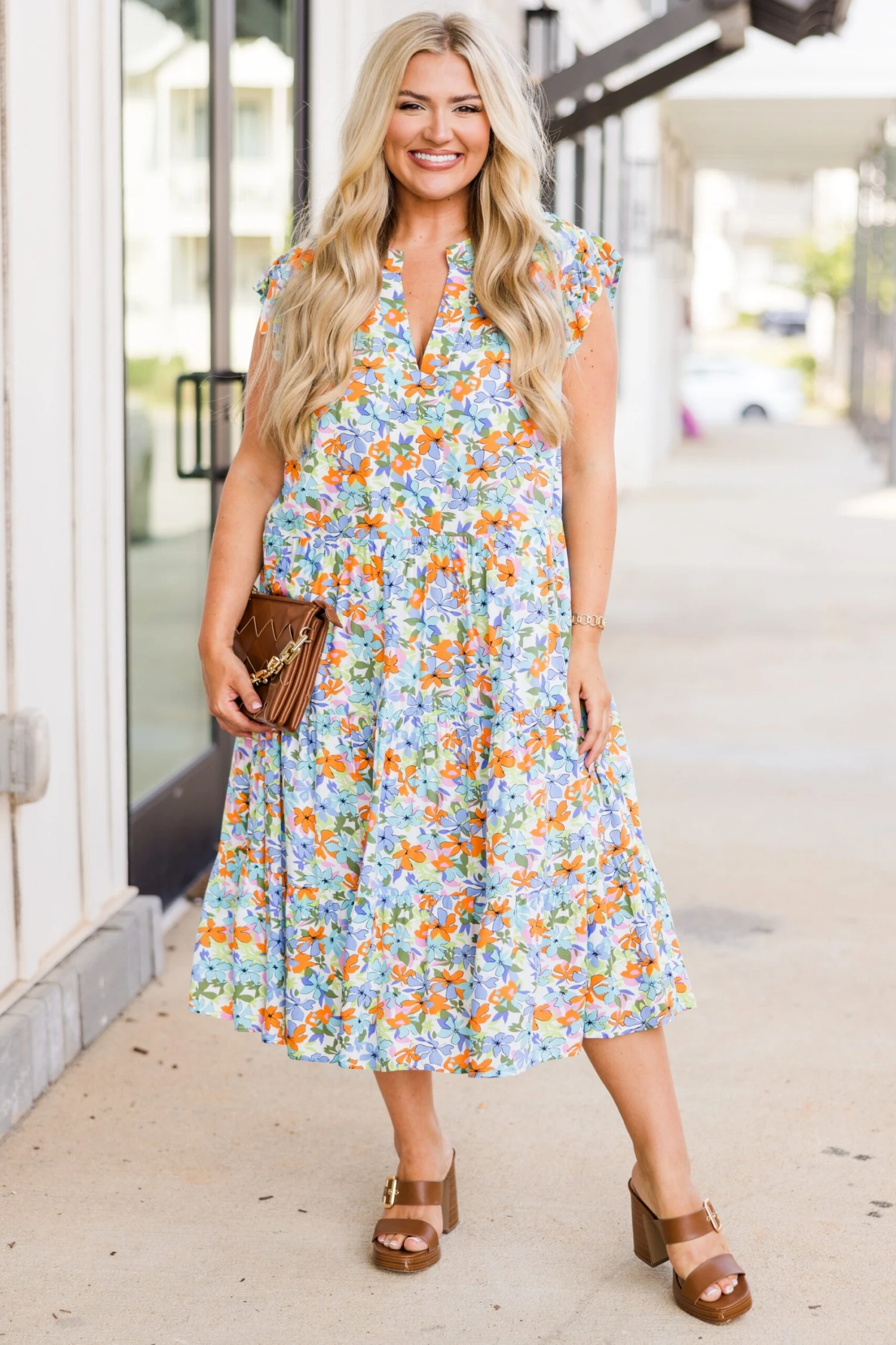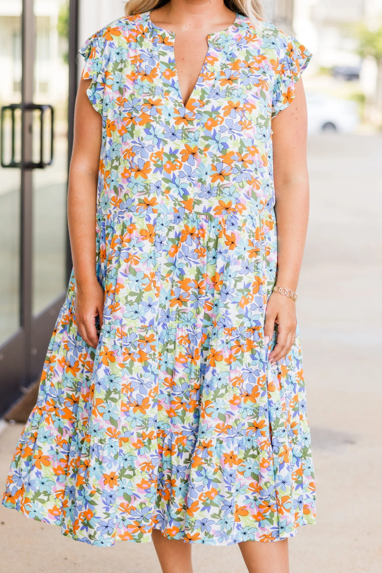 Add a pop of playful fun to your wardrobe with our Tropical Oasis Midi Dress in vibrant blue! Featuring a flirty tiered skirt and a split v-neckline, this dress is perfect for your next tropical adventure! Plus, its fun floral print is sure to make a statement! Pack it in your suitcase and let the vacation roll in!