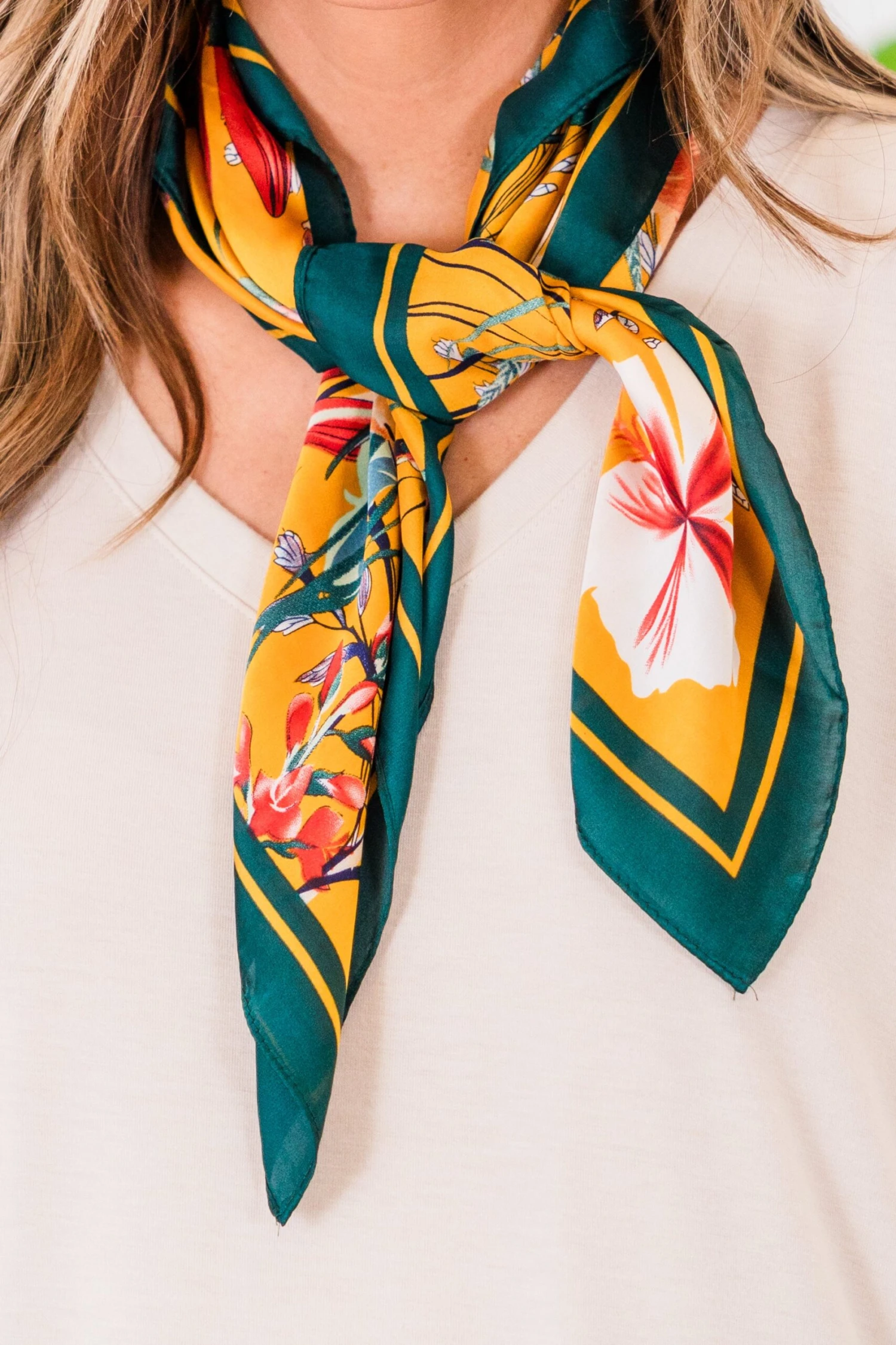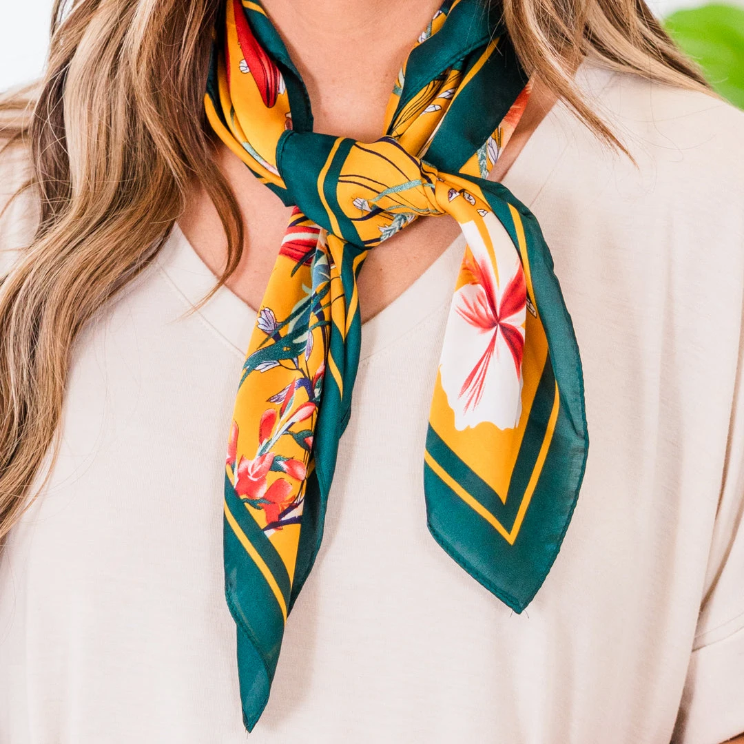 Get vacay ready with this adorable scarf! It features a bold multi-color floral pattern, making it the perfect accessory for your next adventure! Its vibrant design adds a pop of color to any outfit, while its lightweight material ensures comfort and convenience on the go!