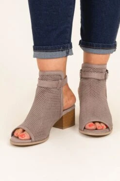 Walk the walk and talk the talk in these booties! These have a cute mesh pattern with a fun open heel and toe for a flirty touch! These trendy cuties have a block heel so you can stay comfy and the taupe color can match anything! Style these with some skinnies and a fun top for the perfect look