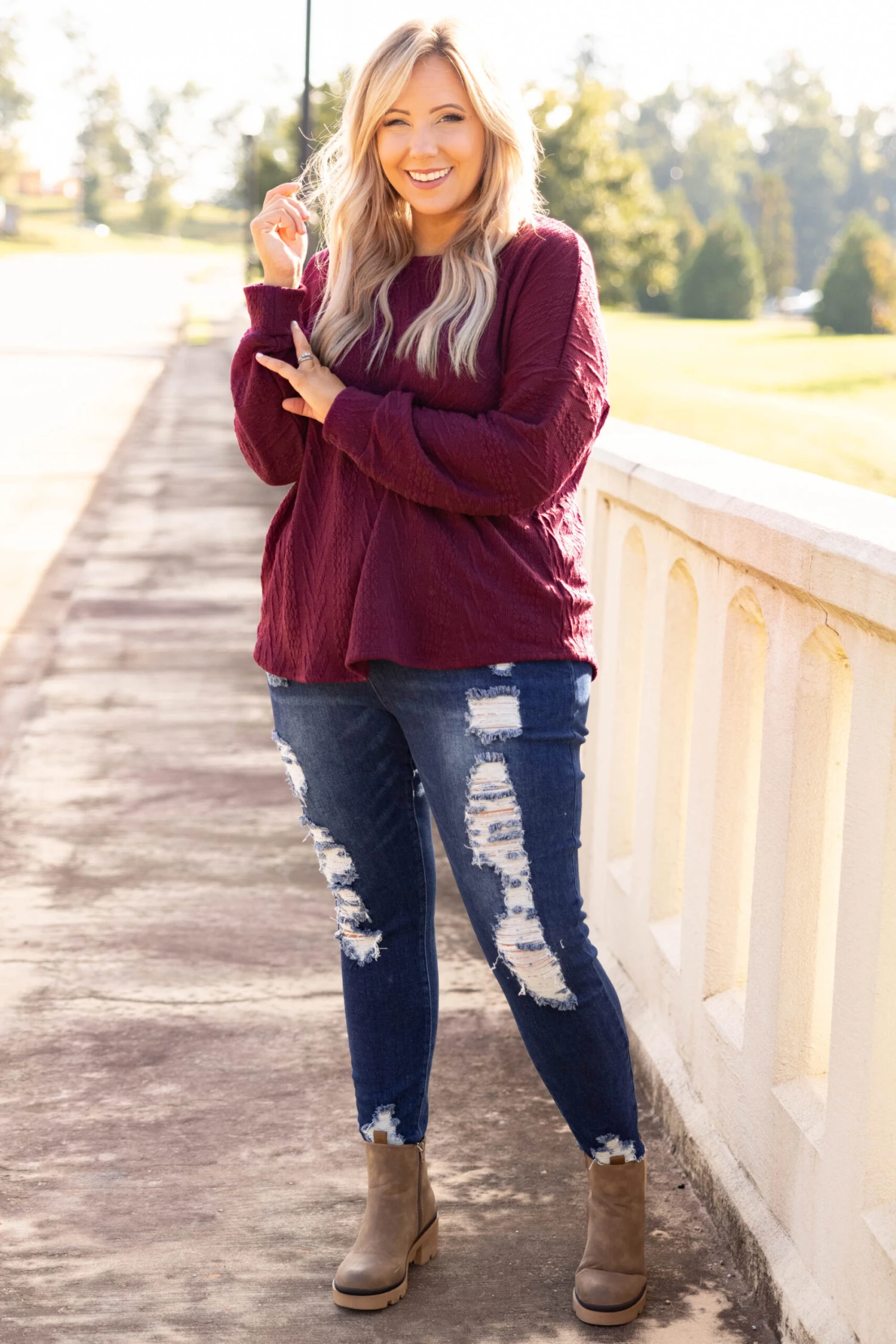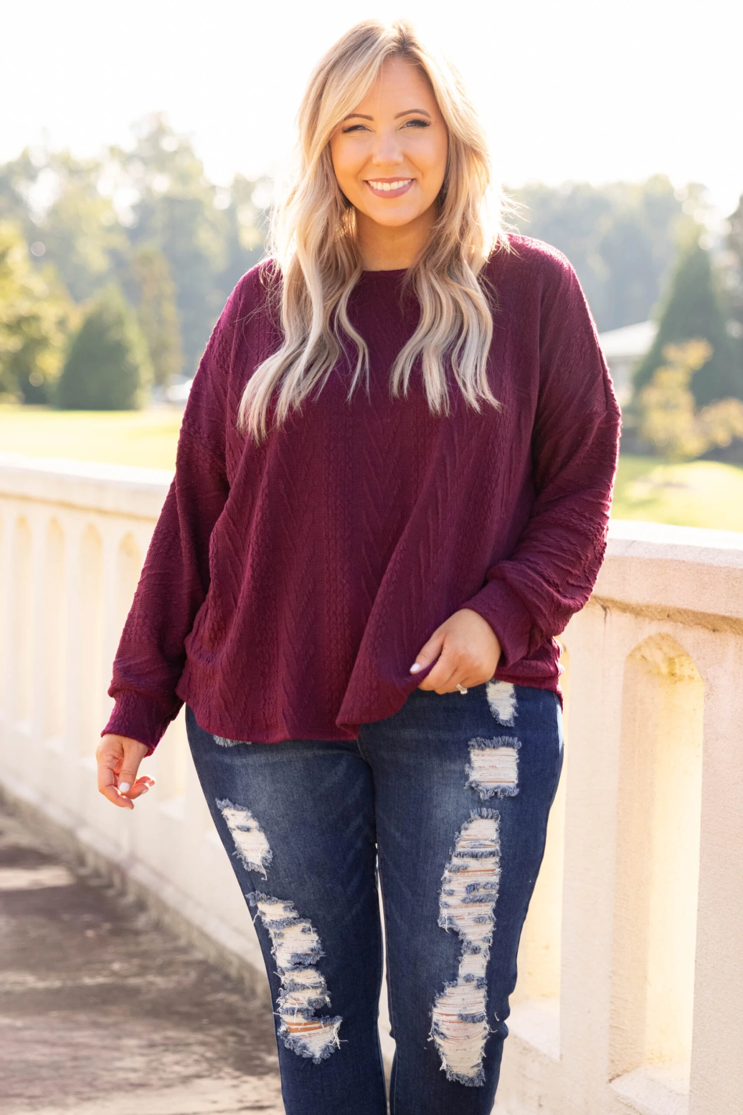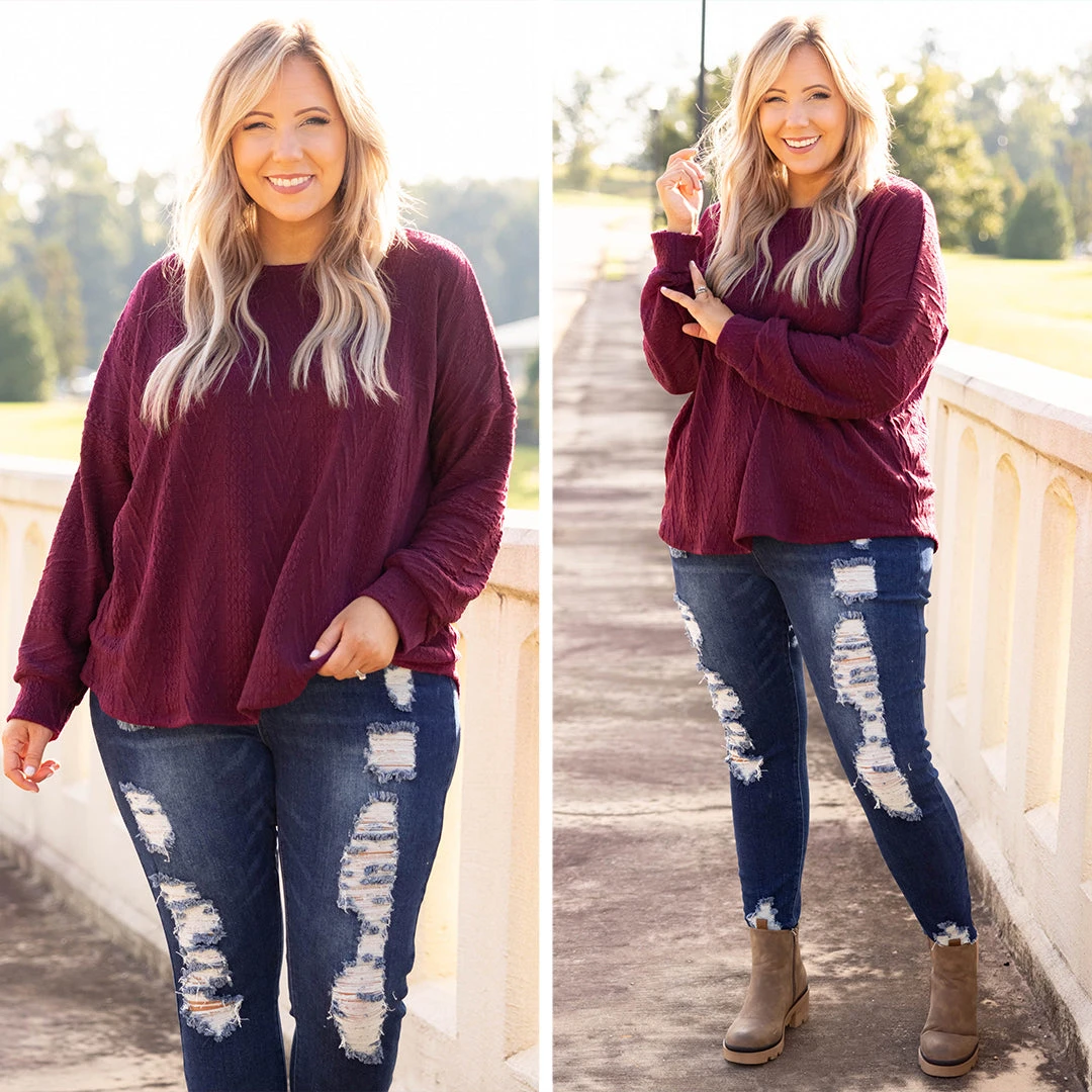 You will want to rock this chic top 24/7! It has a super relaxed, oversized fit and a dreamy textured & soft fabric! We love the burgundy color and how easy it is to wear casual or dressed up! Pair it with leggings and sneakers for a chill day or dress it up with a statement necklace and skinnies for a night out!