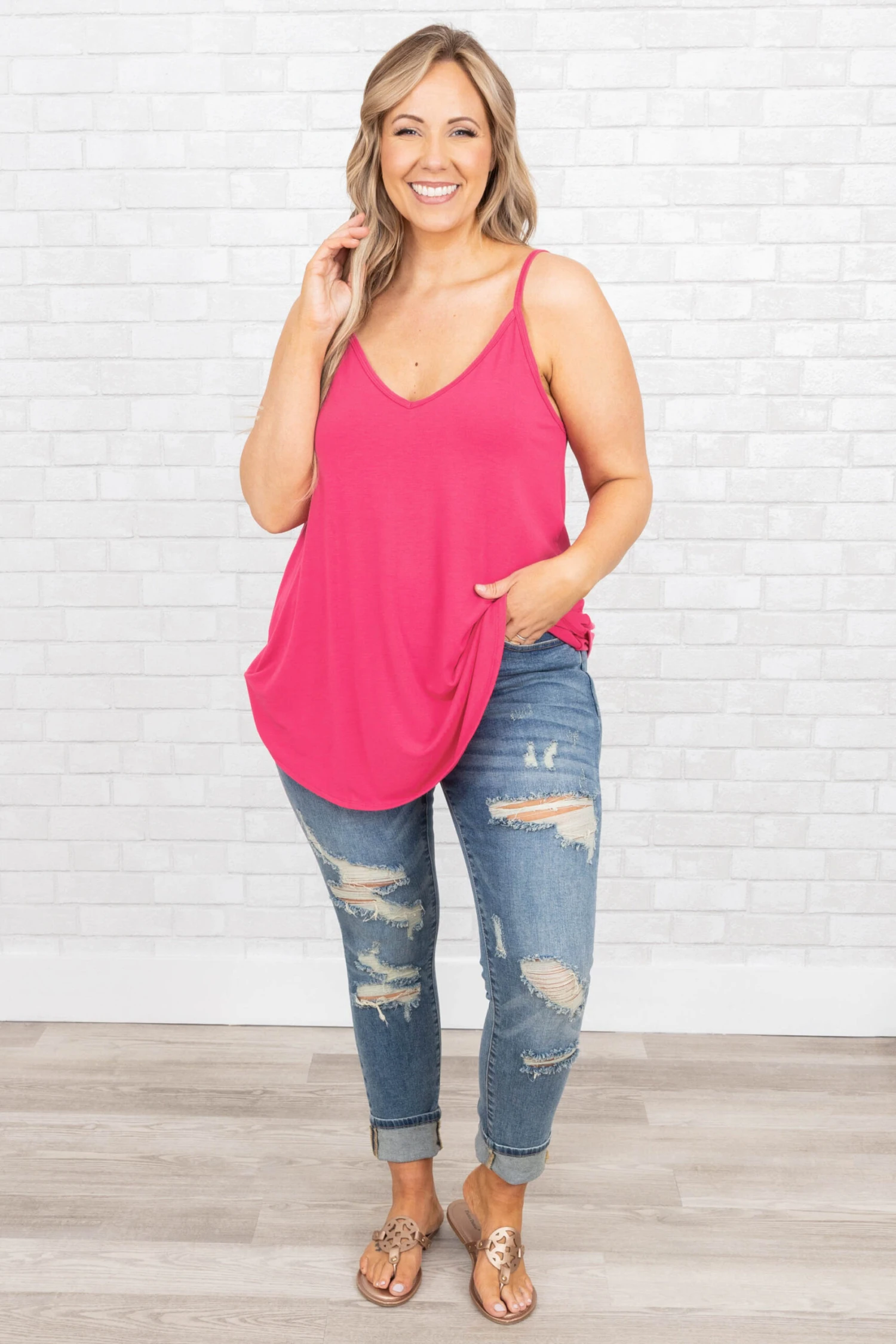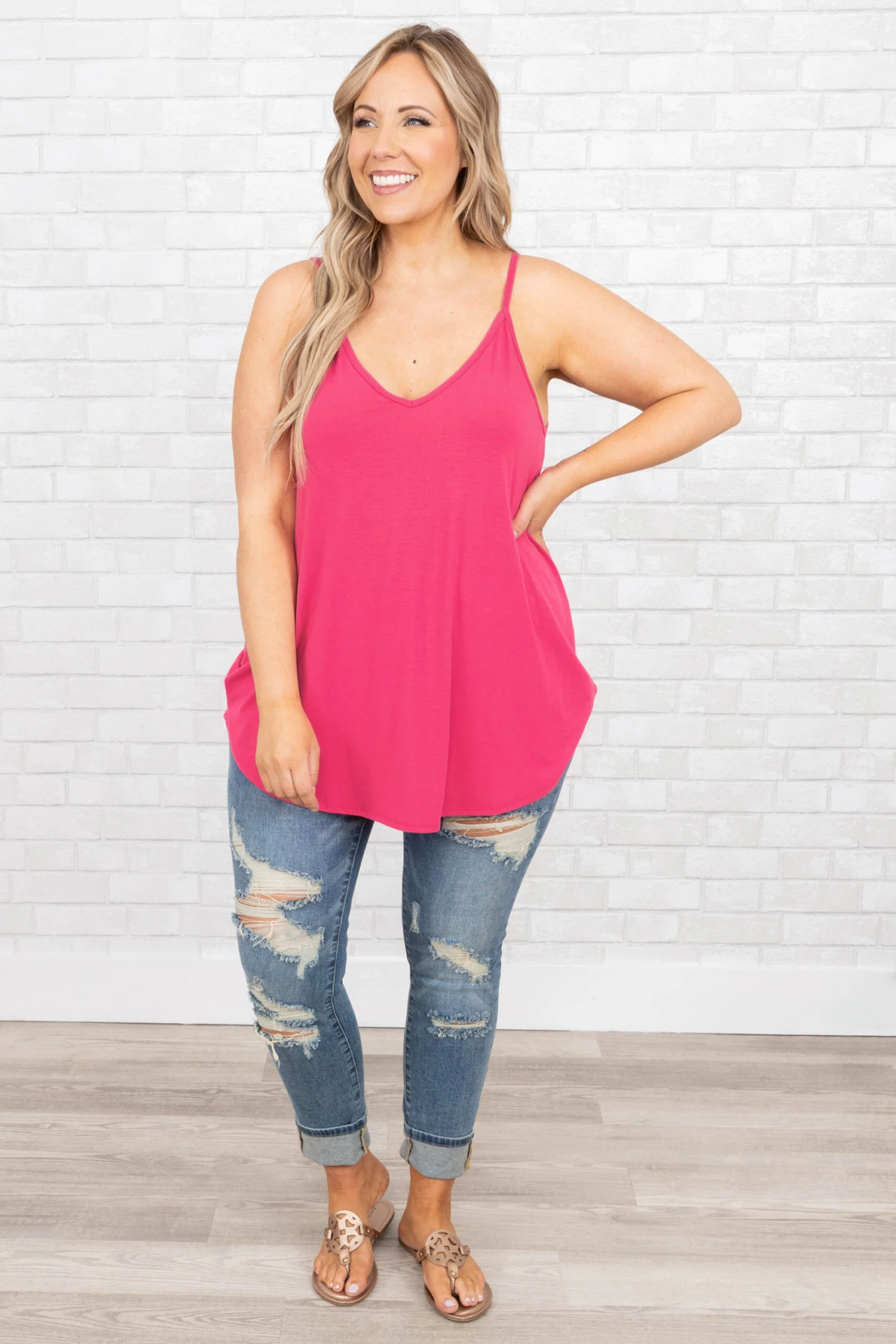 Feeling warm from the sun? Take off your kimono and reveal this chic tank! This loose-fitting tank is perfect for layering with your favorite pieces and wearing on its own! It’s easy to dress up or down, while the tunic length looks good with everything in your wardrobe, and the hot pink color is gorgeous! Not to mention how flattering the fit is! Simply, style this tank with skinnies and sandals for an effortlessly beautiful outfit and add cute accessories for a bold addition!Â