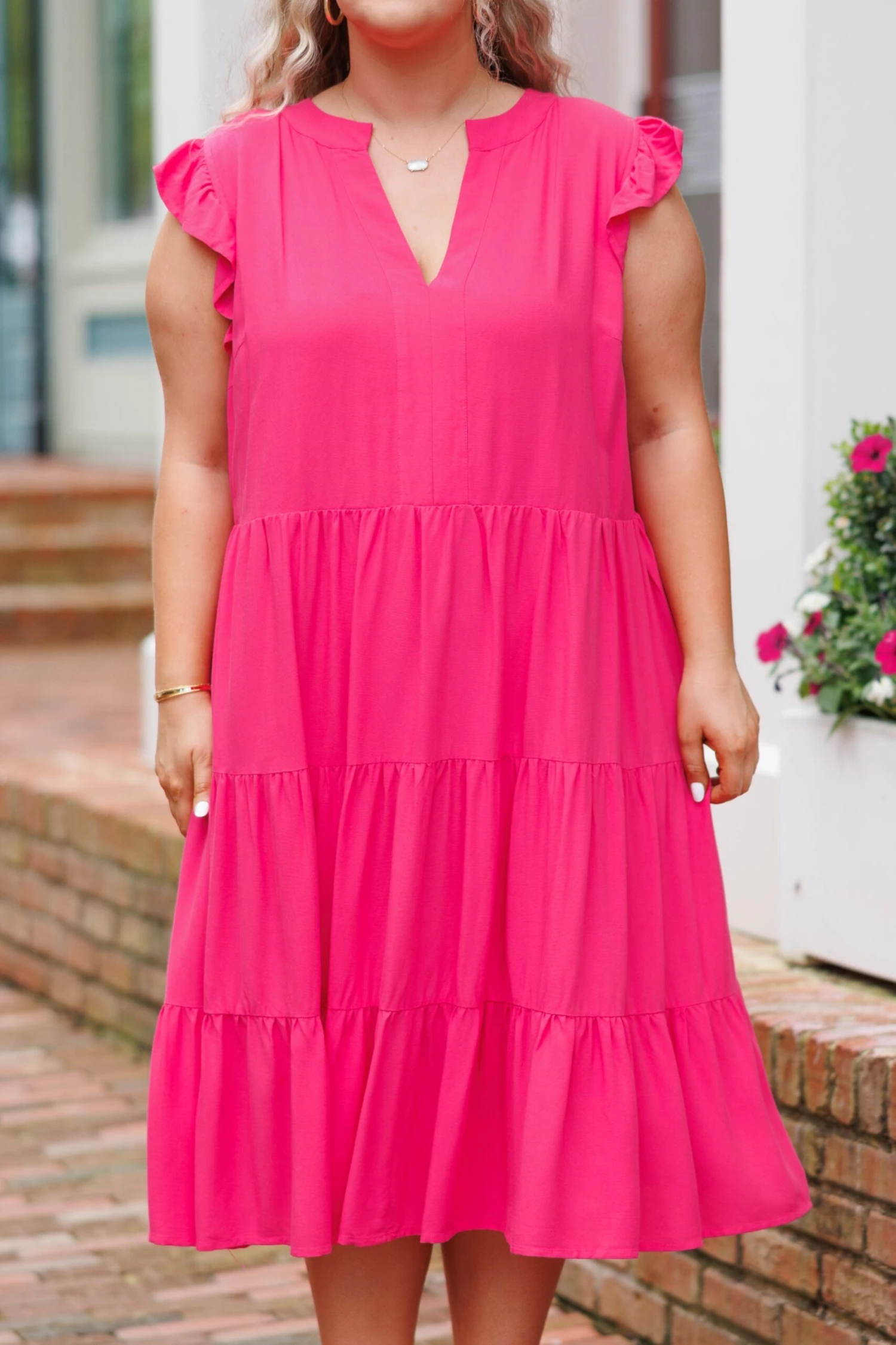 Adding this beautiful dress to your wardrobe won’t be a waste of time! Crafted with flutter sleeves and a hot pink color, this figure-flattering style is perfect for a day out on the town! The flowy fit provides an effortless, comfortable look for any occasion!