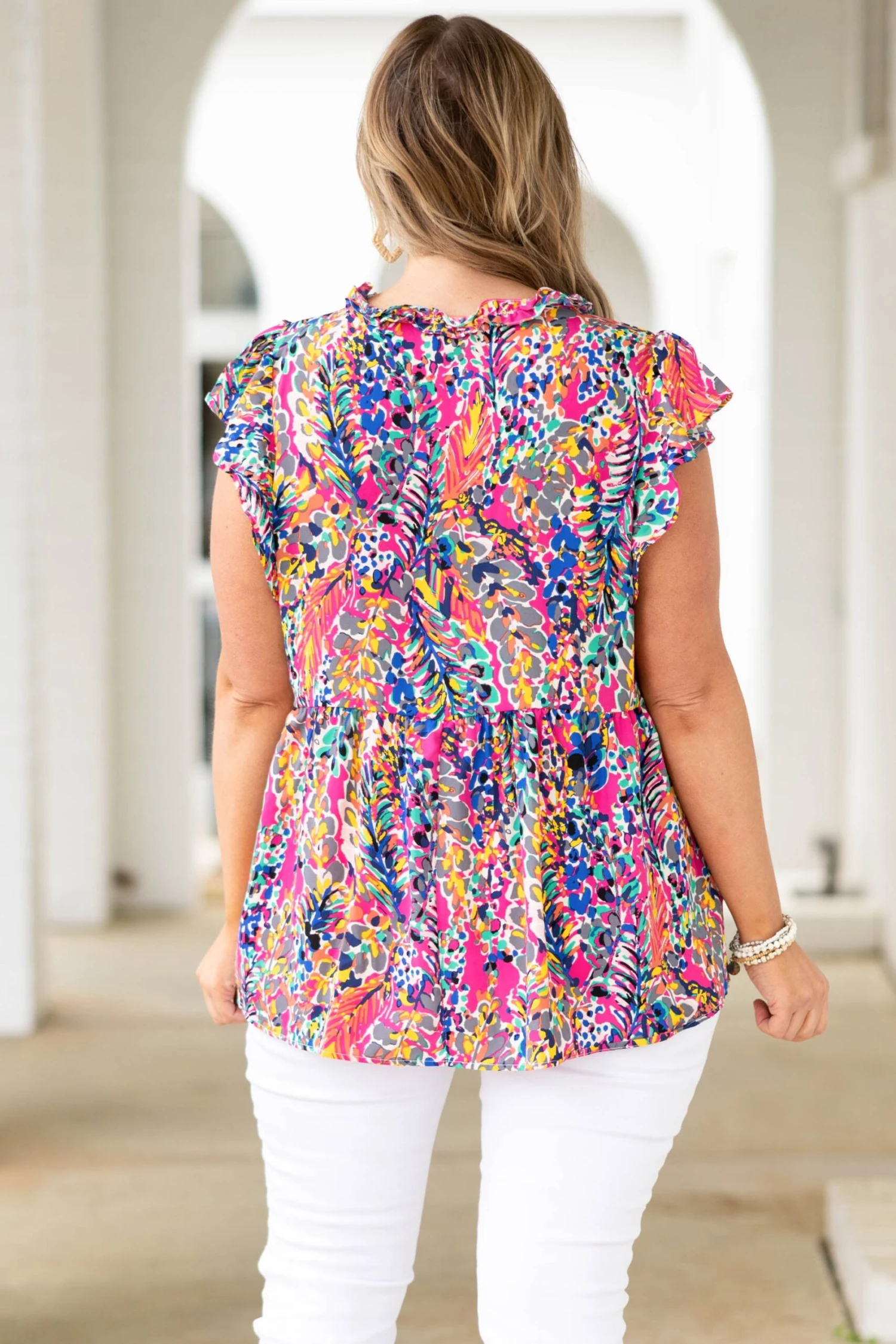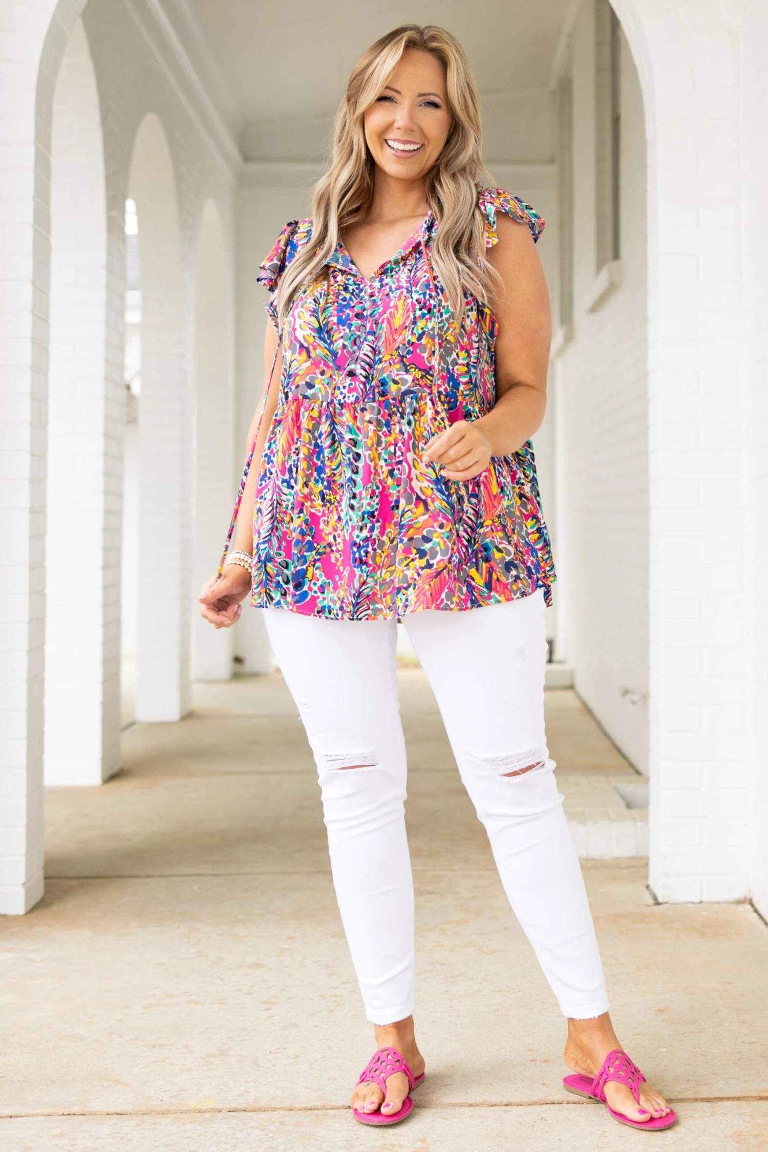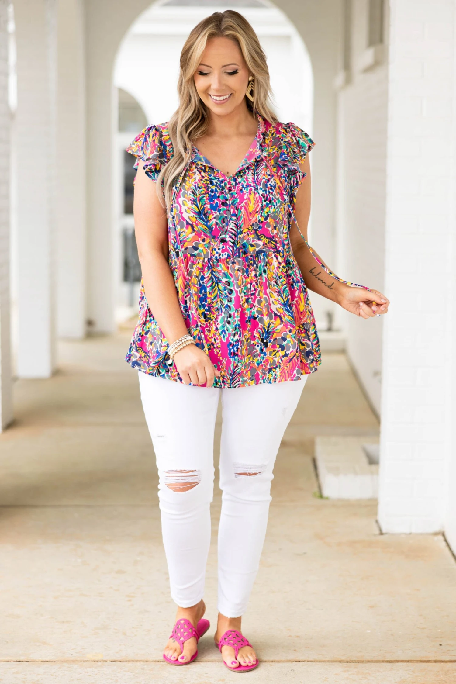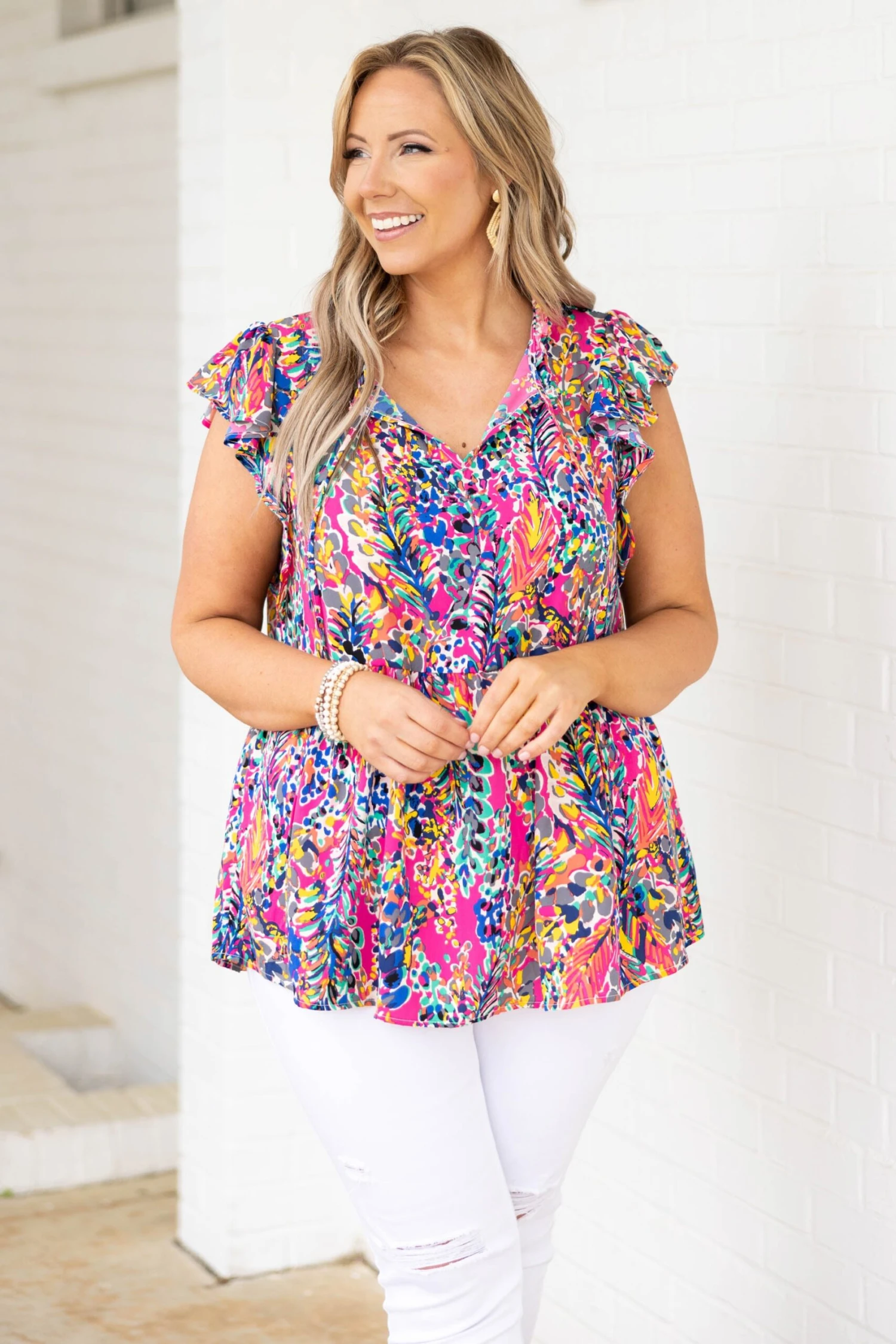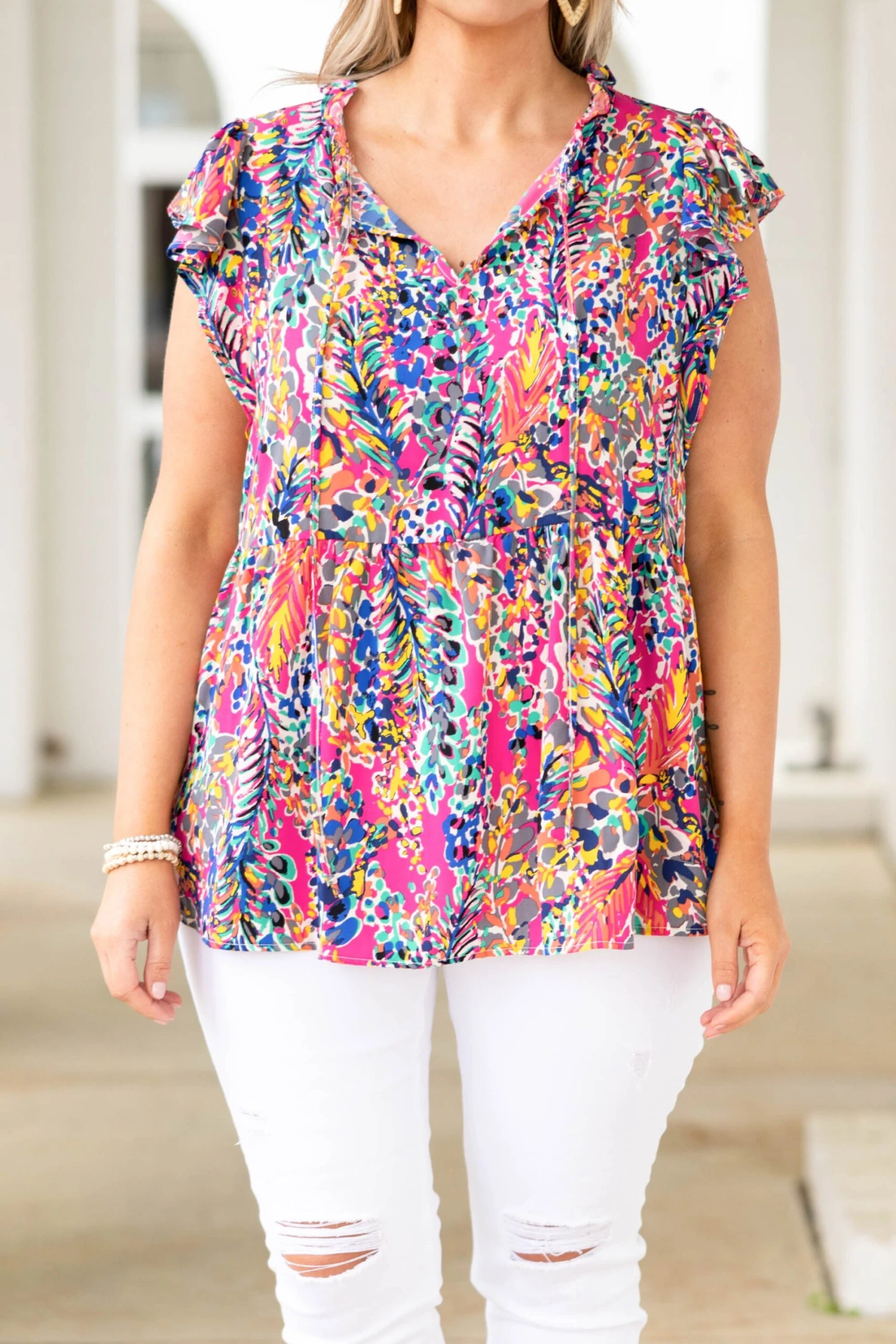 We want to see you in this beautiful top! It has a pretty pink floral design that is perfect for the season! The flutter sleeves and figure flattering fit is great for the office or a day out on the town! We see this top styled with some white denim and sandals for a sassy chic look!