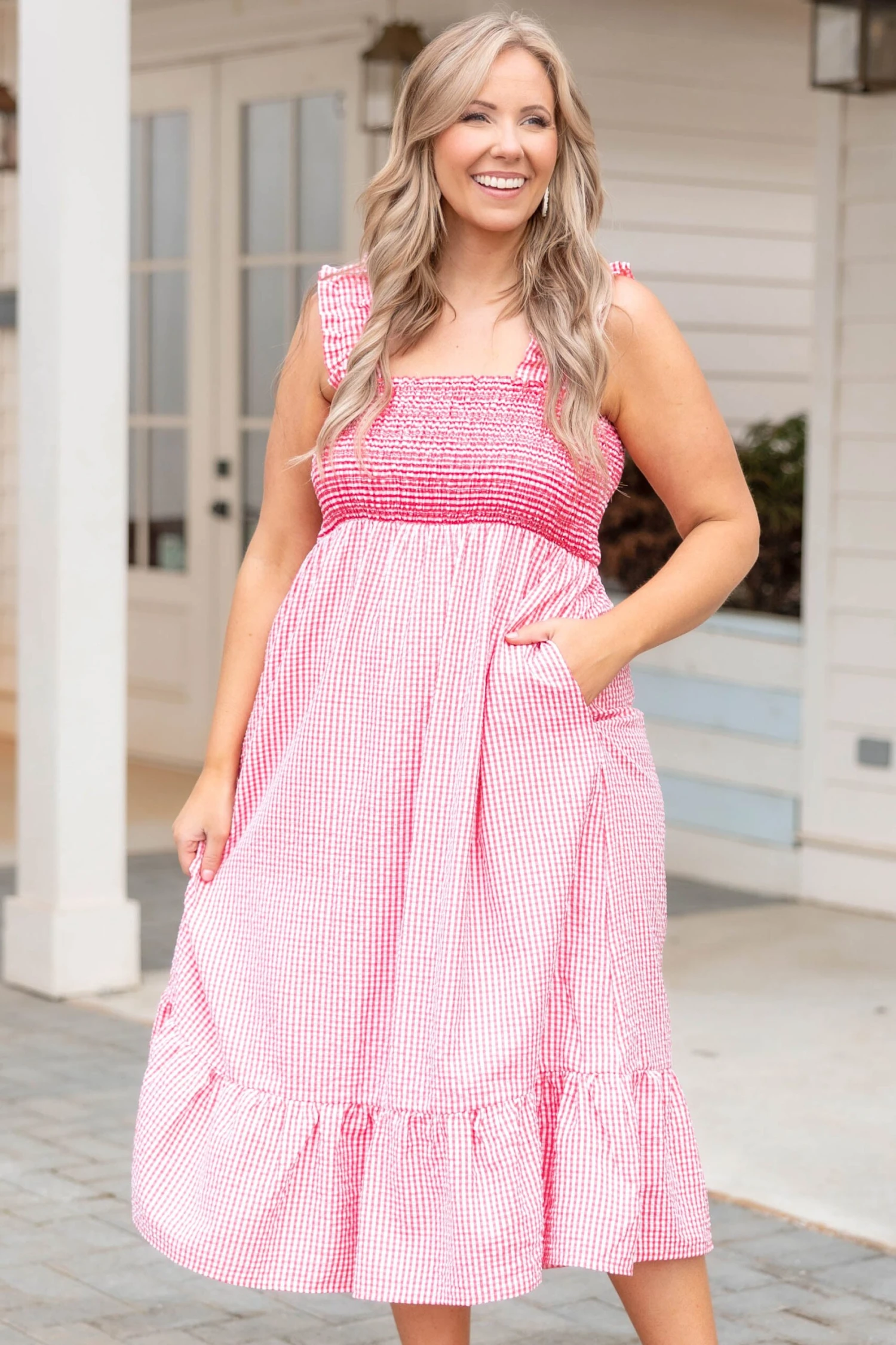 You and this dress would go together perfectly! It has a bold red color with a plaid pattern that is so trendy and sweet! The smocked bodice and flowy fit are perfect for a day out on the town! Style this dress with heels or sandals for a classy chic look!