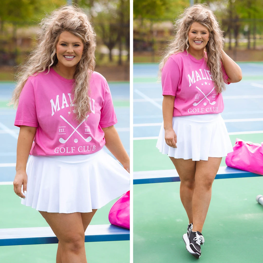 When in Malibu, golf! Get ready to tee off in this pink tee. Show off your athletic skills and your impeccable fashion in this fun style! Pair with a cute tennis skirt so that you can be ready for the court or a pair of shorts so that you can hit the streets with your bestie. Either way, you will be match set on point!