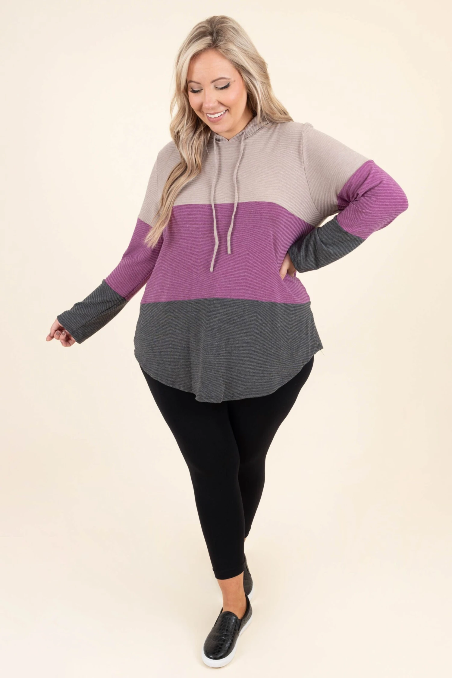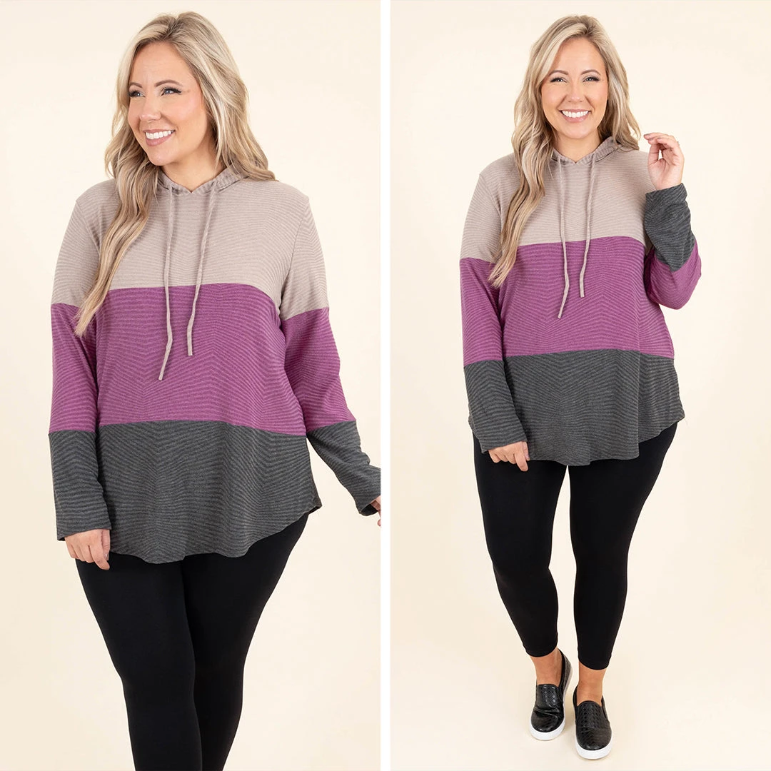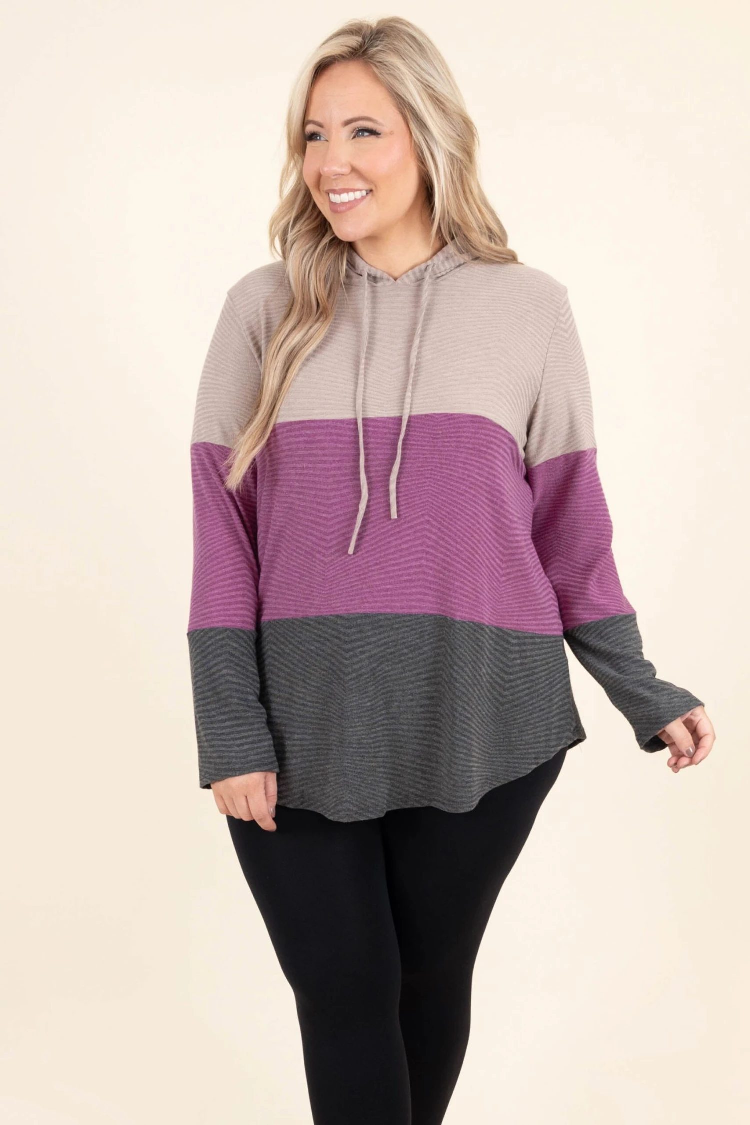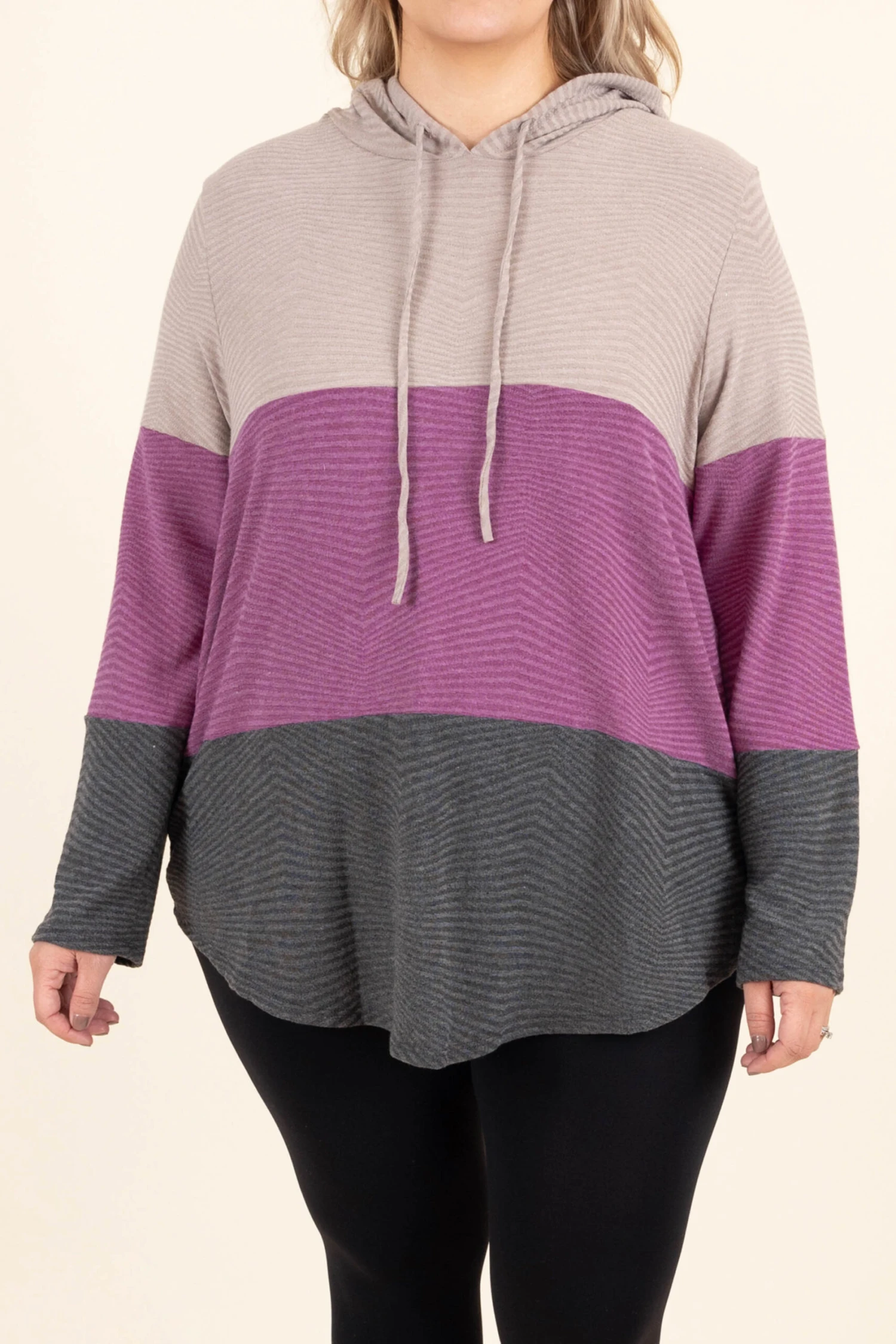 This cute and oh-so-comfy hoodie is here to be your new fave! It has a trendy purple color block style and a hood to keep you extra warm this season! Throw it on any day of the week for a cute and super cozy outfit!