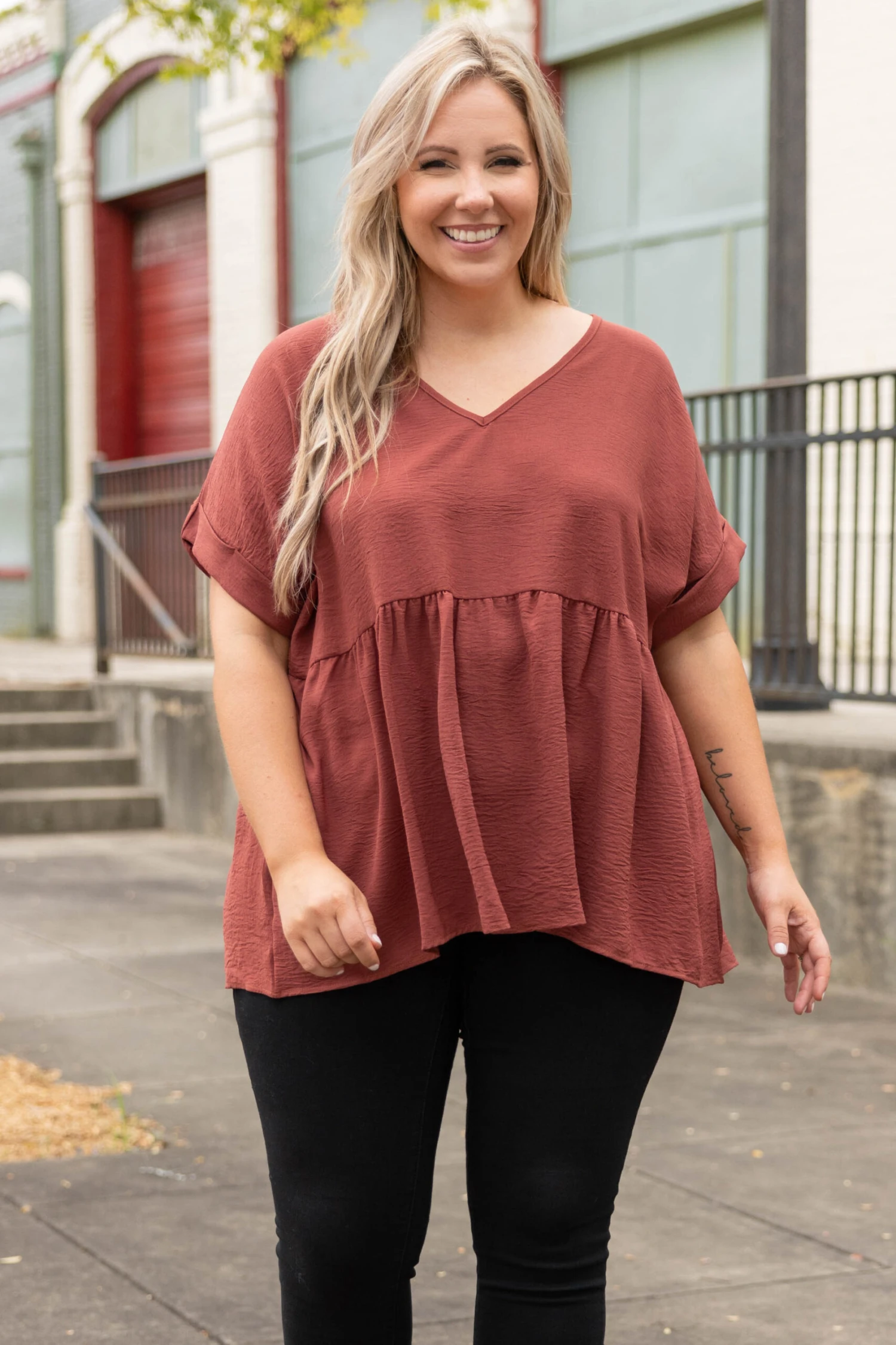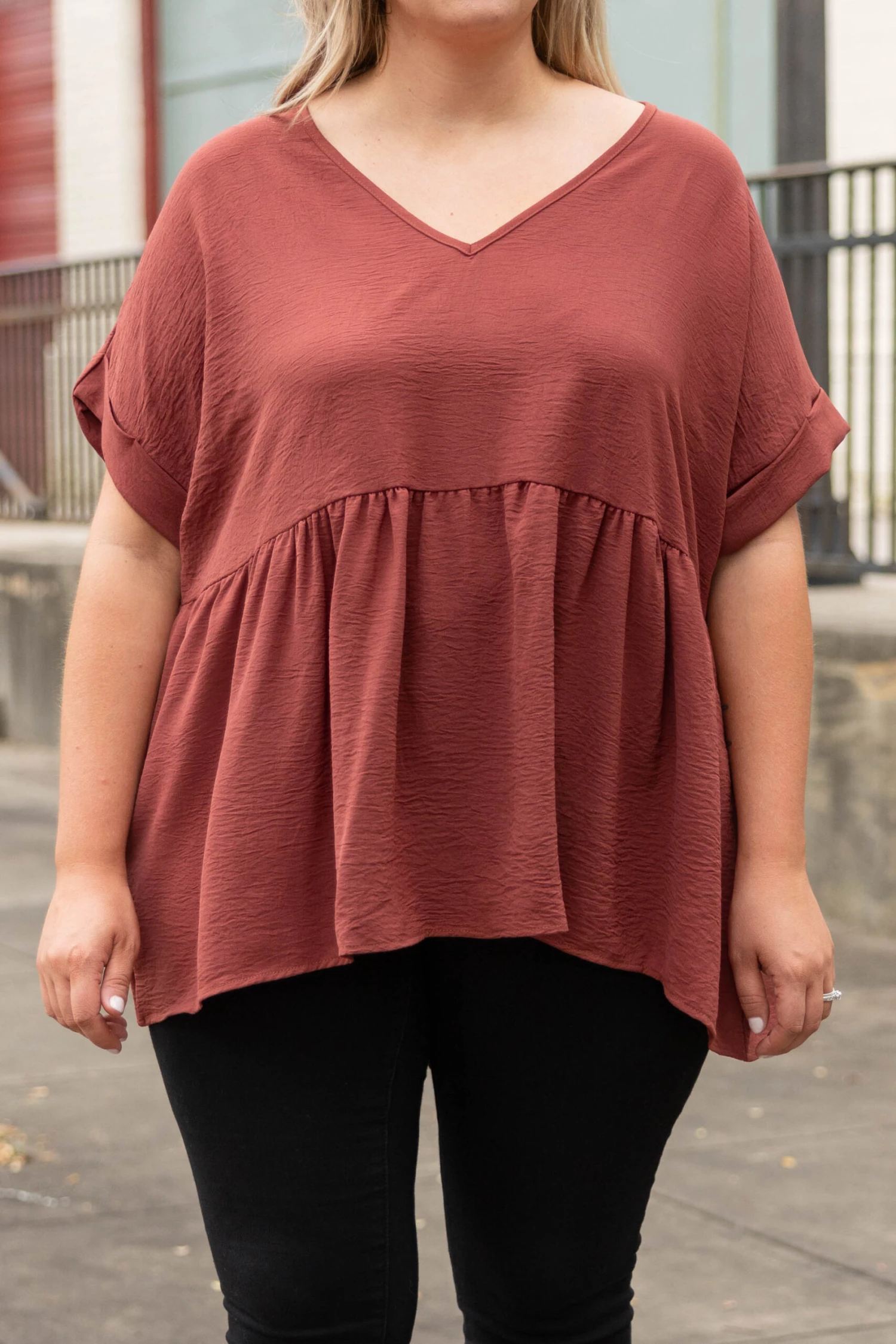Expect many wide-eyed gazes when you’re wearing this top! This top has a sleek design with a pretty red brown color you can dress up or down and style for every occasion! It’s comfortable for all-day wear, has a figure-flattering baby doll fit, and features the cutest cuffed-sleeves for the ultimate trendy look! Simply style this top with skinnies and booties for an easy, everyday outfit!Â