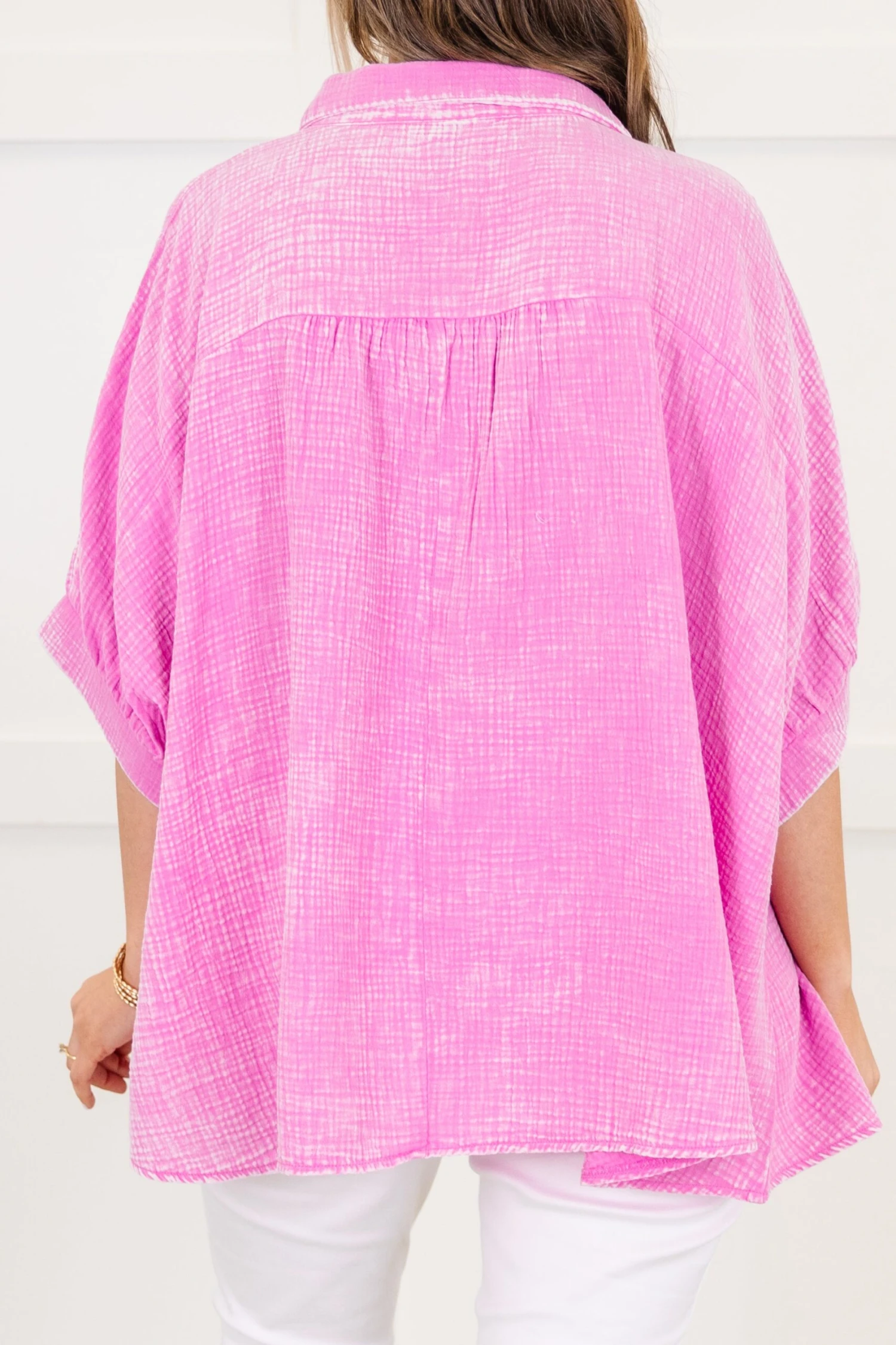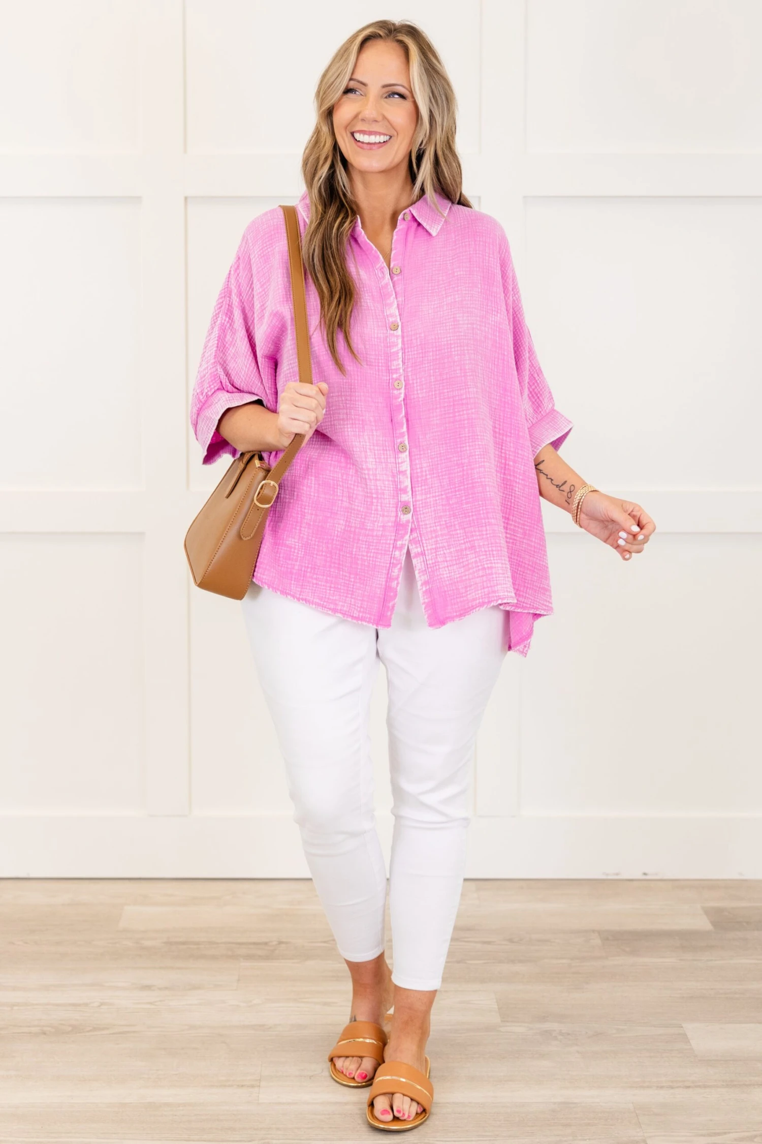 Unleash your carefree spirit in our Wistful Weekend Top! Crafted from washed double gauze, this button down shirt features half sleeves for a laid-back vibe! Perfect for a relaxed weekend look, it’s time to embrace your inner cool in bright mauve!