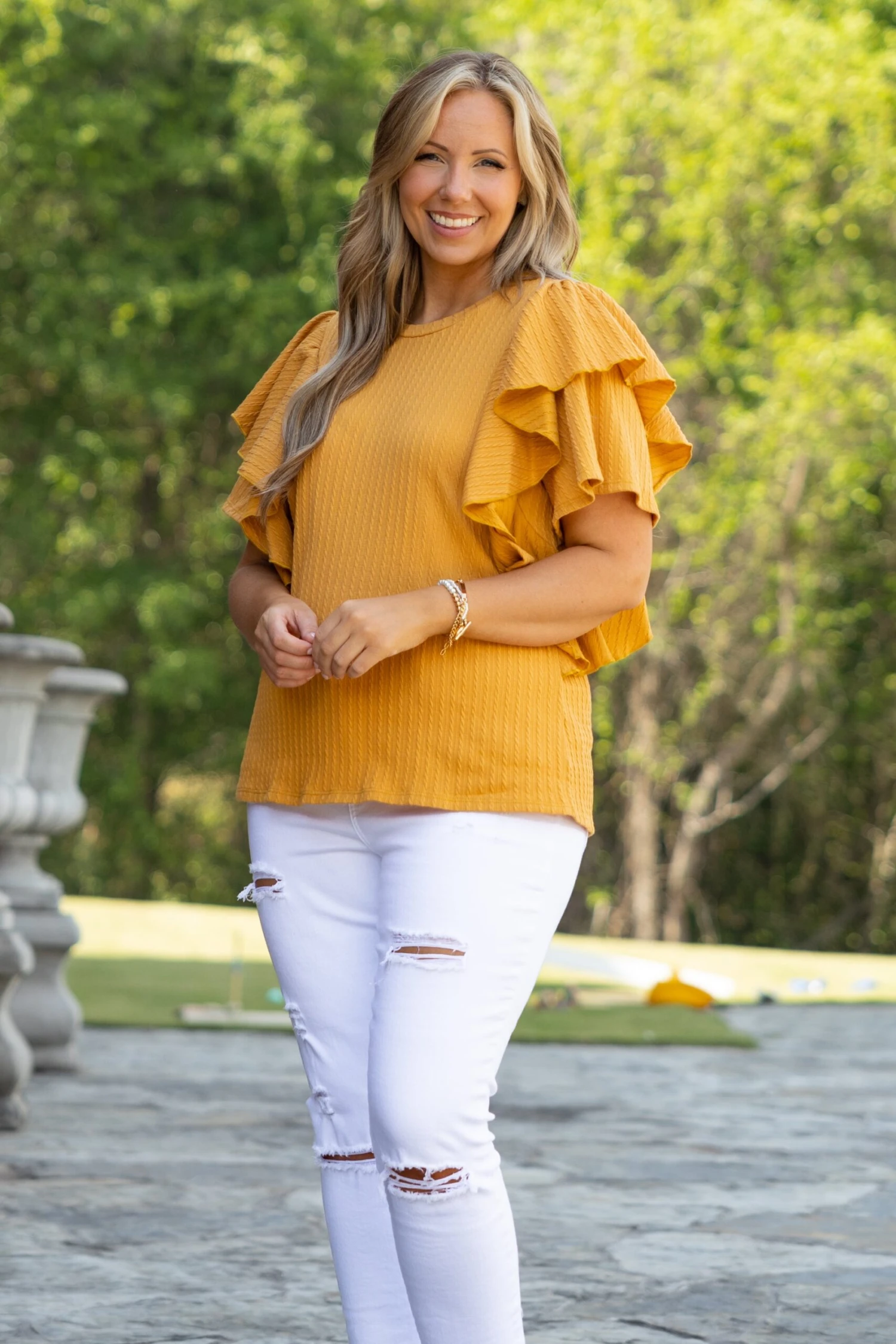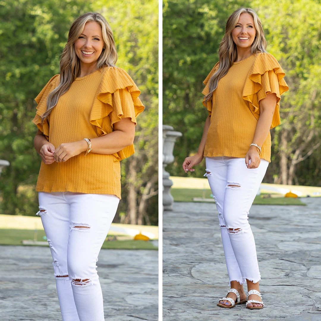 This top is made of a lightweight and textured fabric, making it perfect for summer wear! Its flutter sleeves provide a breathable and comfortable fit, while its simple yet stylish design completes any look! Enjoy sunny days while remaining cool and fashionable!
