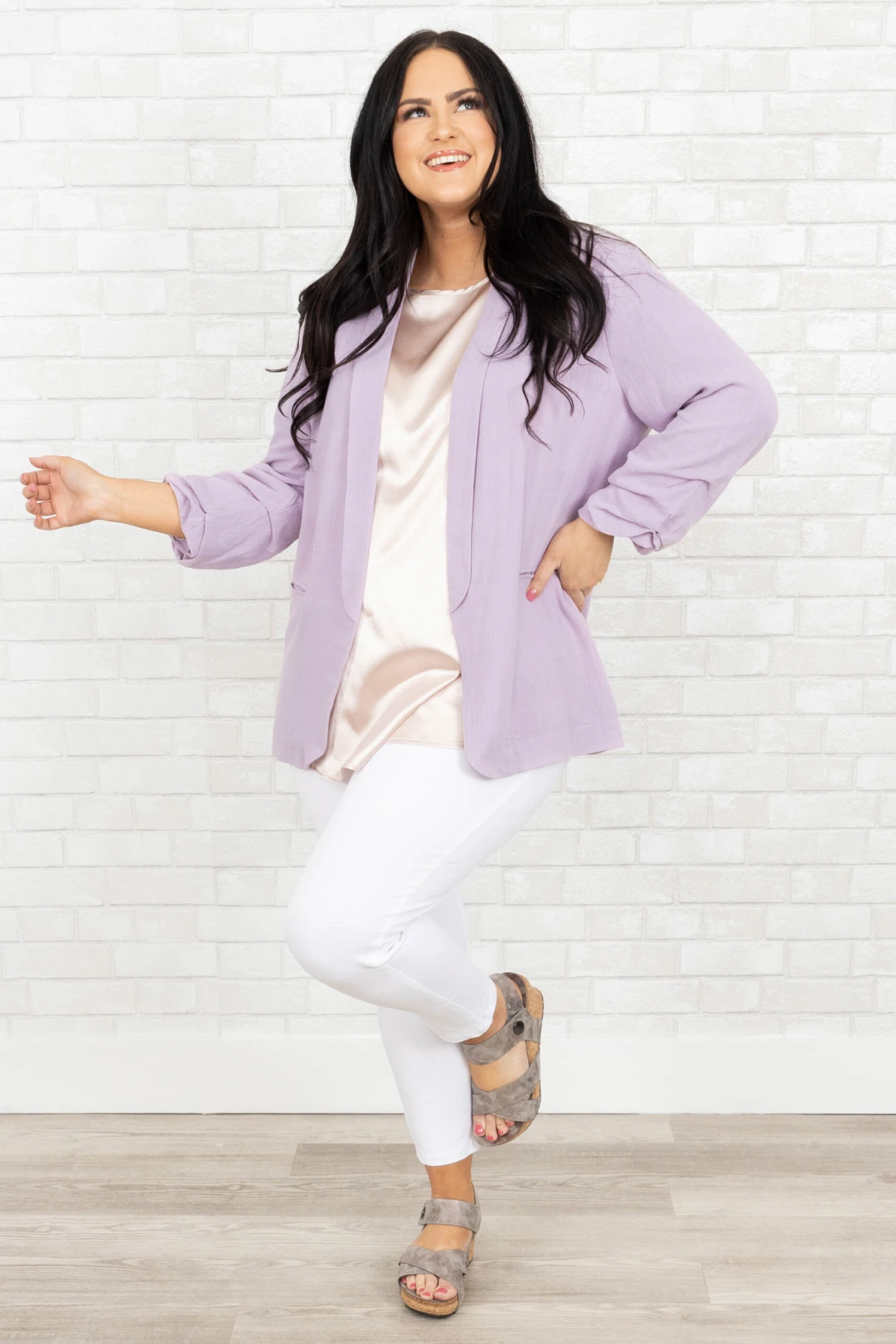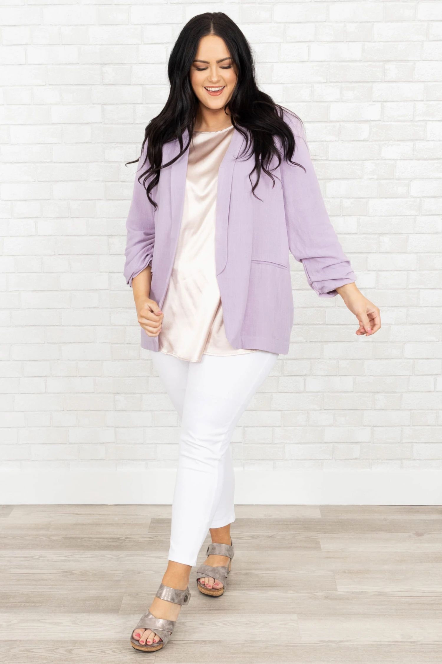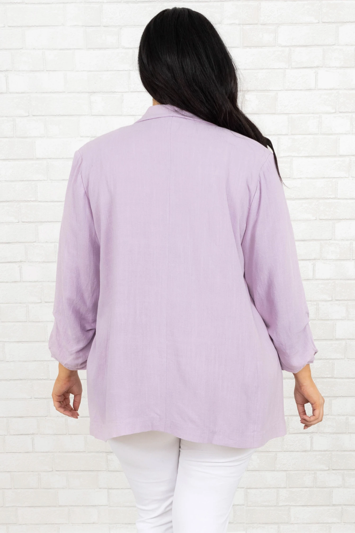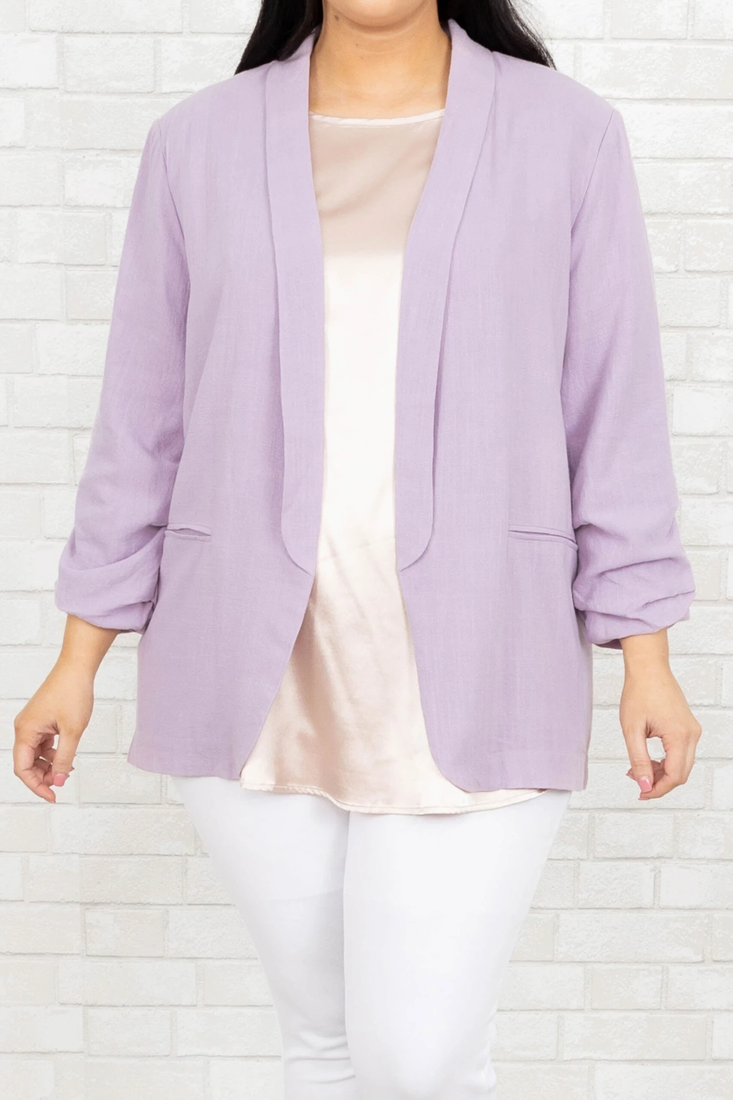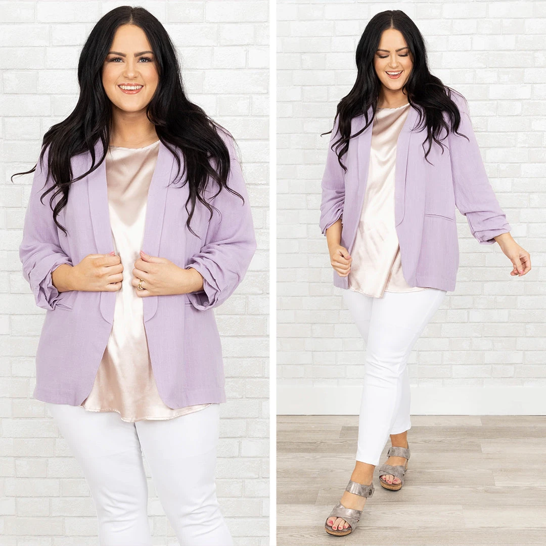 Work in style in this jacket! It has a solid lilac color that’s perfect for the season! It’s comfortable for all-day wear, has an oversized fit, and can be styled with your favorite shoes and accessories! Simply, pair this jacket with a cute top or dress for an effortlessly chic look!Â
