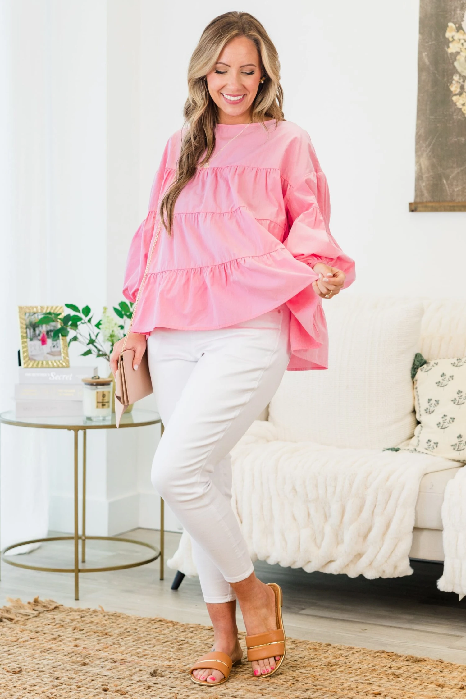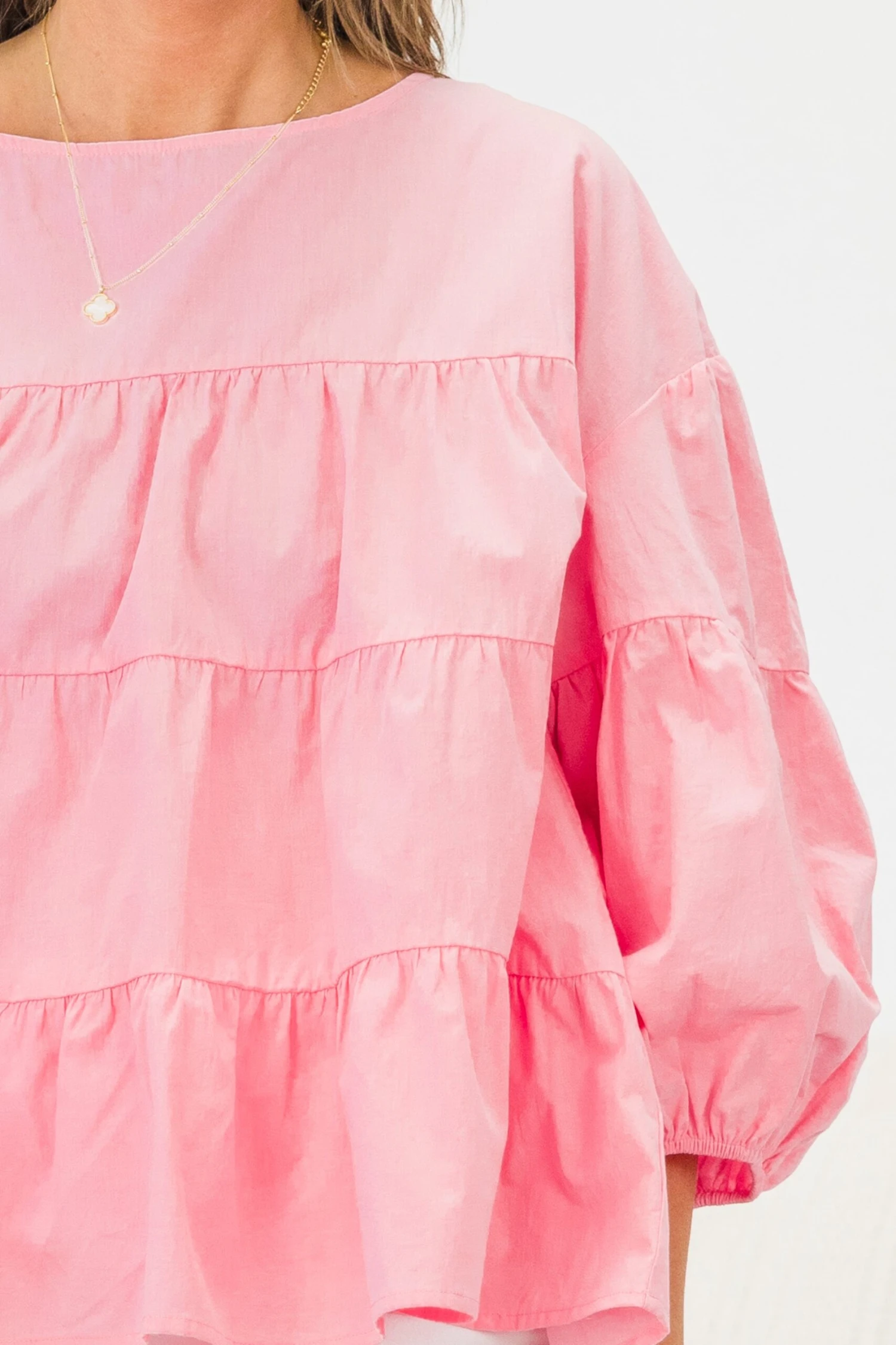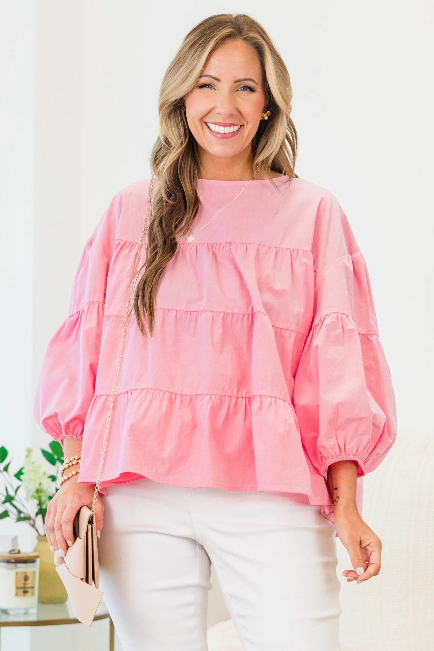 Elevate your style with this pink top! With its round neck, bubble sleeves, and tiered design, this blouse adds a touch of elegance to any outfit! The elastic cuffs provide a comfortable fit, making it perfect to pair with your favorite denim and booties! Upgrade your wardrobe today!