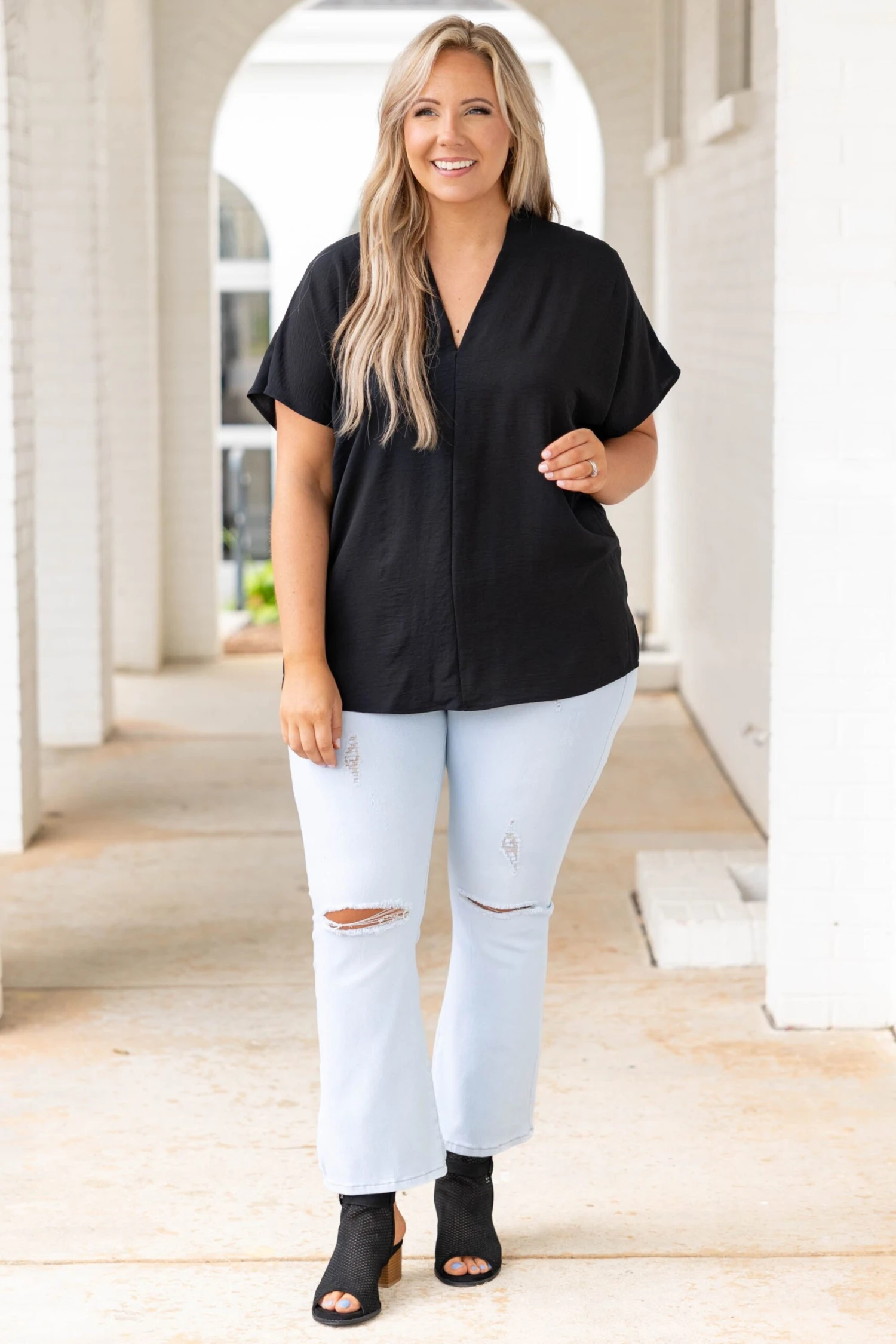 Let this top compliment your lifestyle! The bold black color and sweet neckline is just what you need this season for your wardrobe! The flowy fit and versatility this top has is simply perfect! Dress this top up with a cute skirt and heels or keep it casual with some distressed jeans and booties for a fierce, chic look!